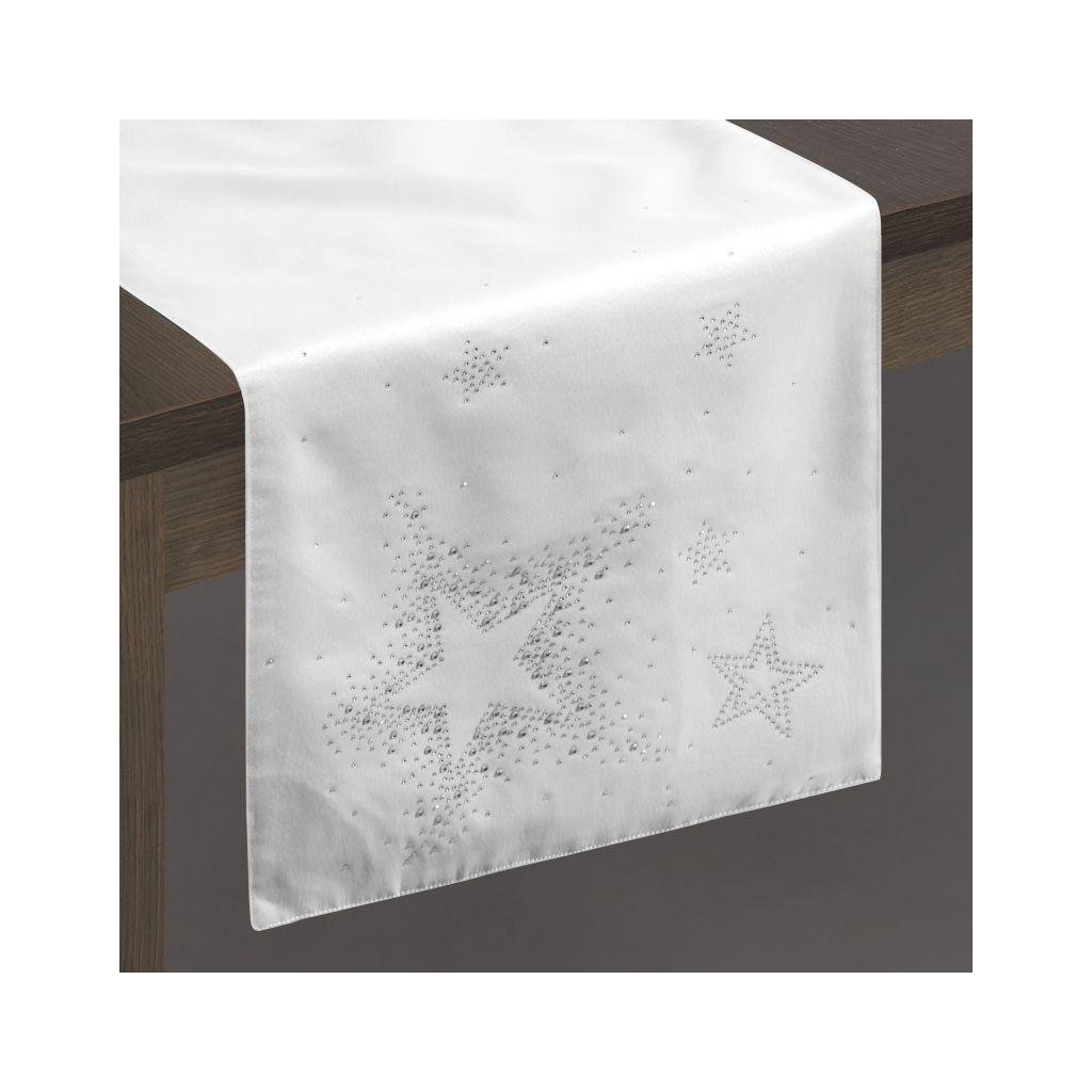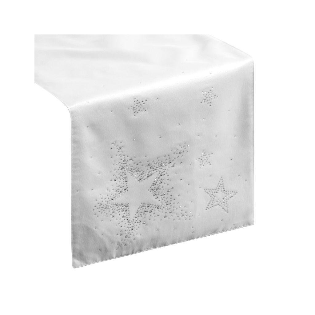 Slavnostní běhoun na vánoční stůl vyrobený z hladké bílé látky se stříbrným odleskem. Okraje zdobí lesklé kubické zirkony . , šířka: 35 cm, délka: 180 cm, Barva: bílá se stříbrným odleskem.