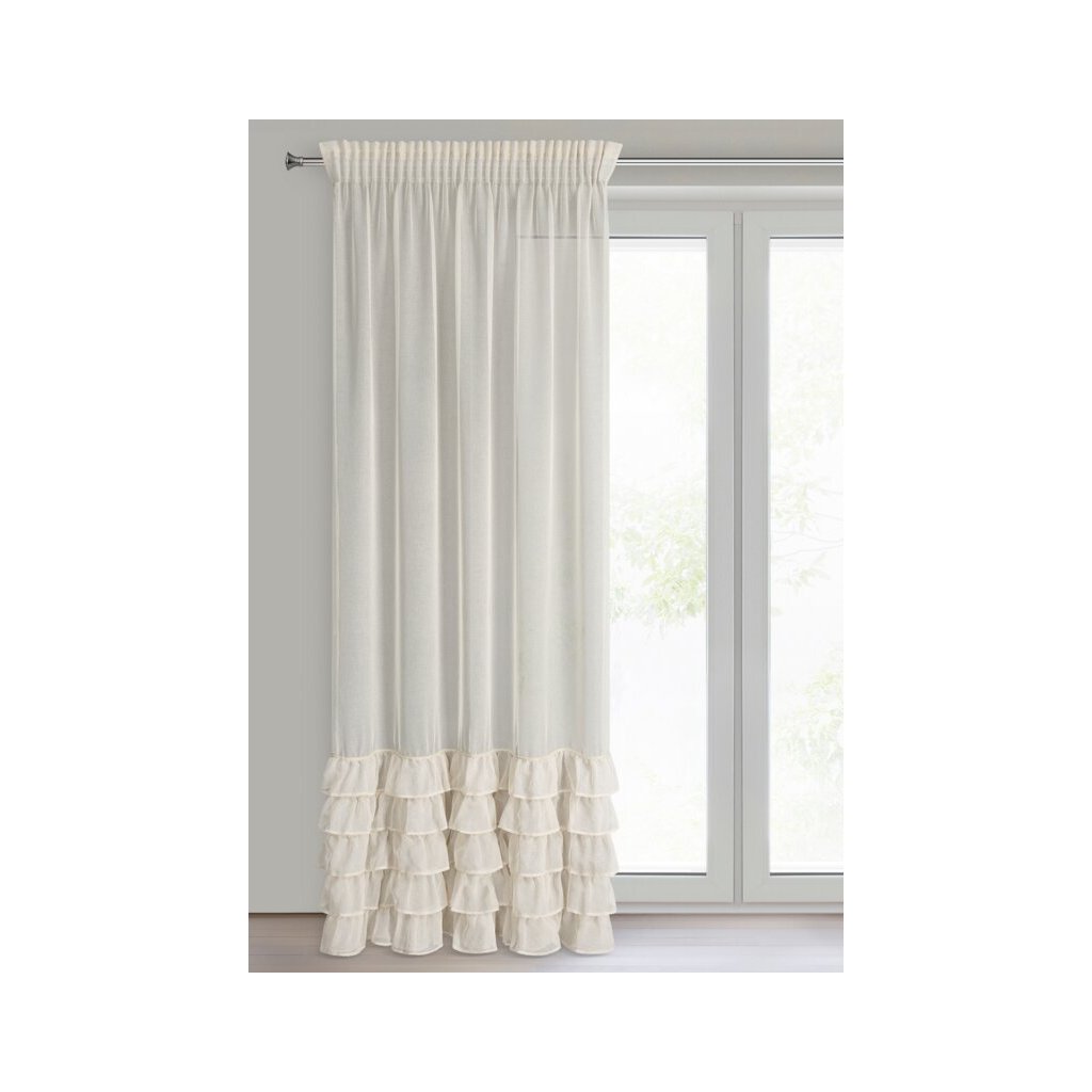 Romantické volány ve spodní části záclony působí jako efektní dekorativní detail , který dodává interiéru šarm a eleganci . Jsou odděleny jemným páskem se štrasovým zdobením , který vnáší do prostoru luxusní nádech a decentní lesk . Díky tomu se záclona stává nejen praktickým doplňkem, ale také výraznou ozdobou každého okna .