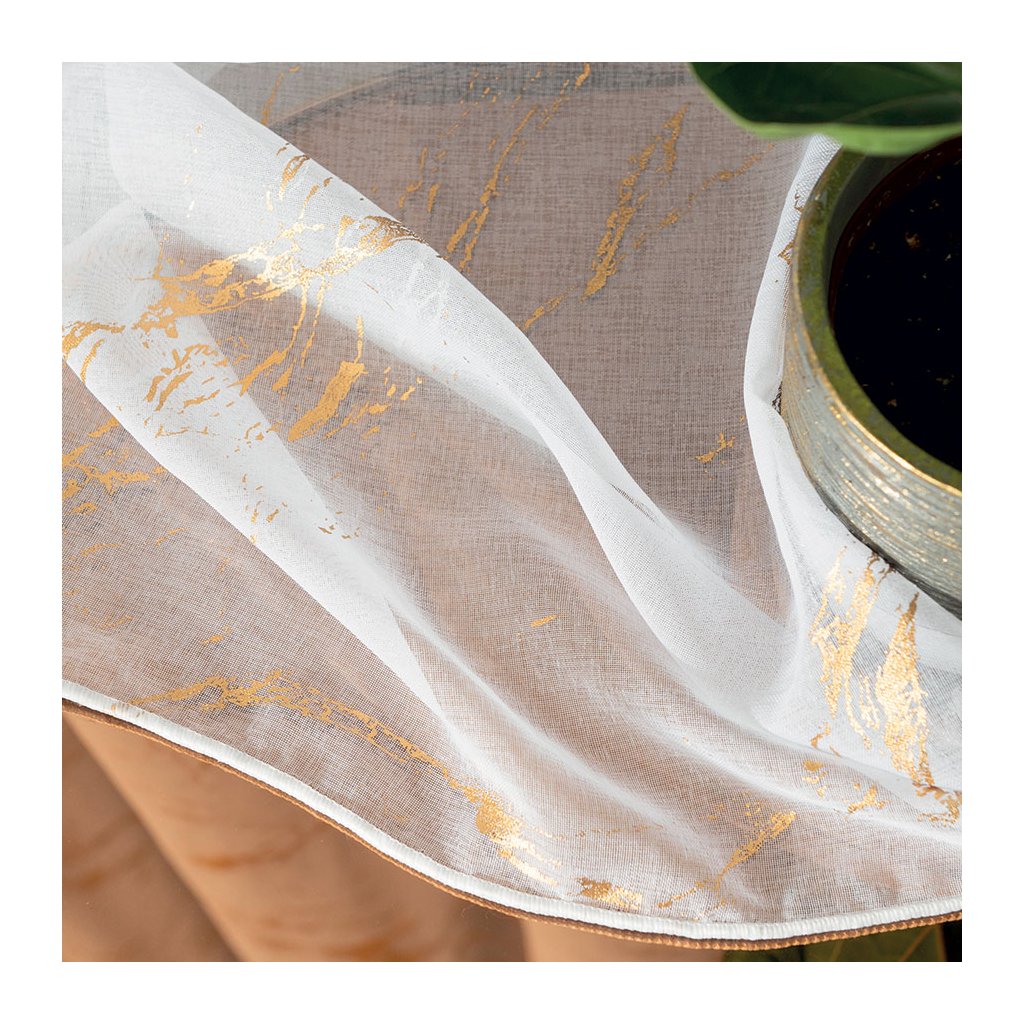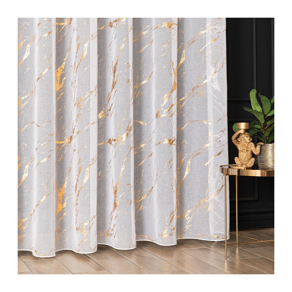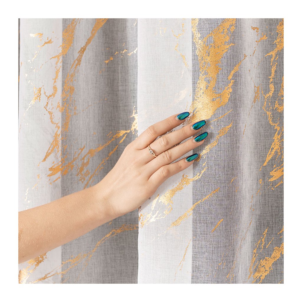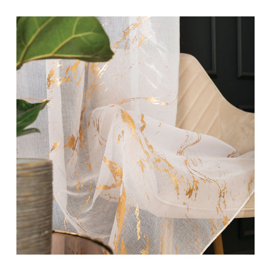 Záclona Marma s moderním zlatým vzorem je výrazným designovým prvkem, který okamžitě upoutá pozornost. Na jemném bílém týlu se vyjímá nepravidelný zlatý mramorový efekt , který působí luxusně a moderně zároveň. Díky této kombinaci působí záclona netradičně, ale zároveň vkusně – ideální pro ty, kdo chtějí interiéru dodat stylový nádech.