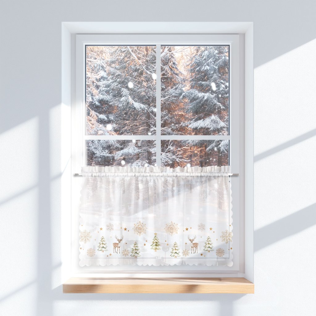 Decentní vánoční potisk působí elegantně a vkusně doladí dekorace , svíčky i světýlka, aniž by je přebíjela. Jemná, poloprůhledná záclona nechá prostor dýchat, ale přitom dodá oknům upravený a slavnostní vzhled – ideální pro dlouhé zimní večery s rodinou a přáteli.