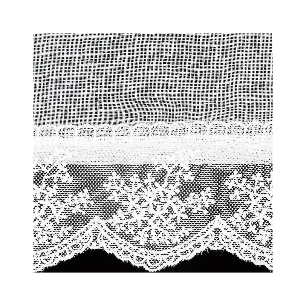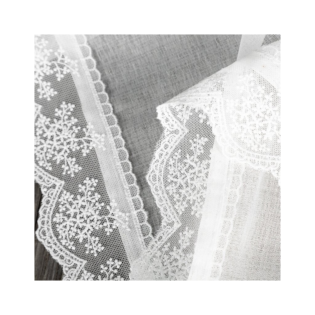 Spodní lem zdobí jemná krajka , která dodává celé dekoraci šarm a něžný, romantický nádech . Záclonka působí vkusně a nadčasově , snadno se kombinuje s ostatním zařízením a je vhodná do různých barevných řešení interiéru.