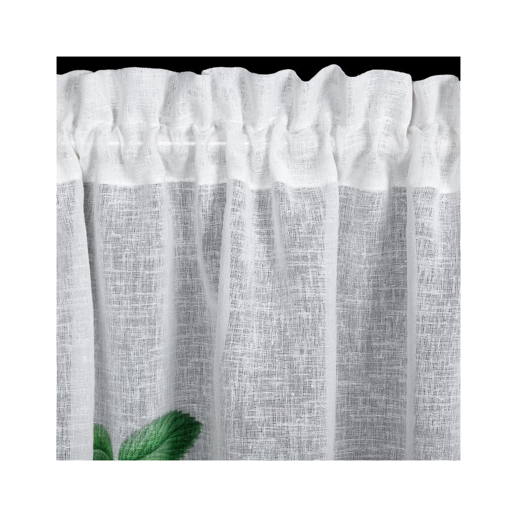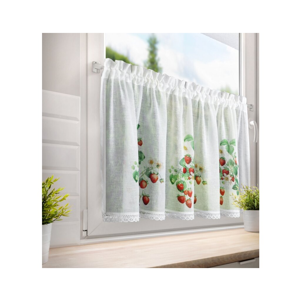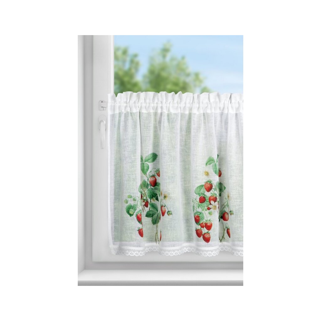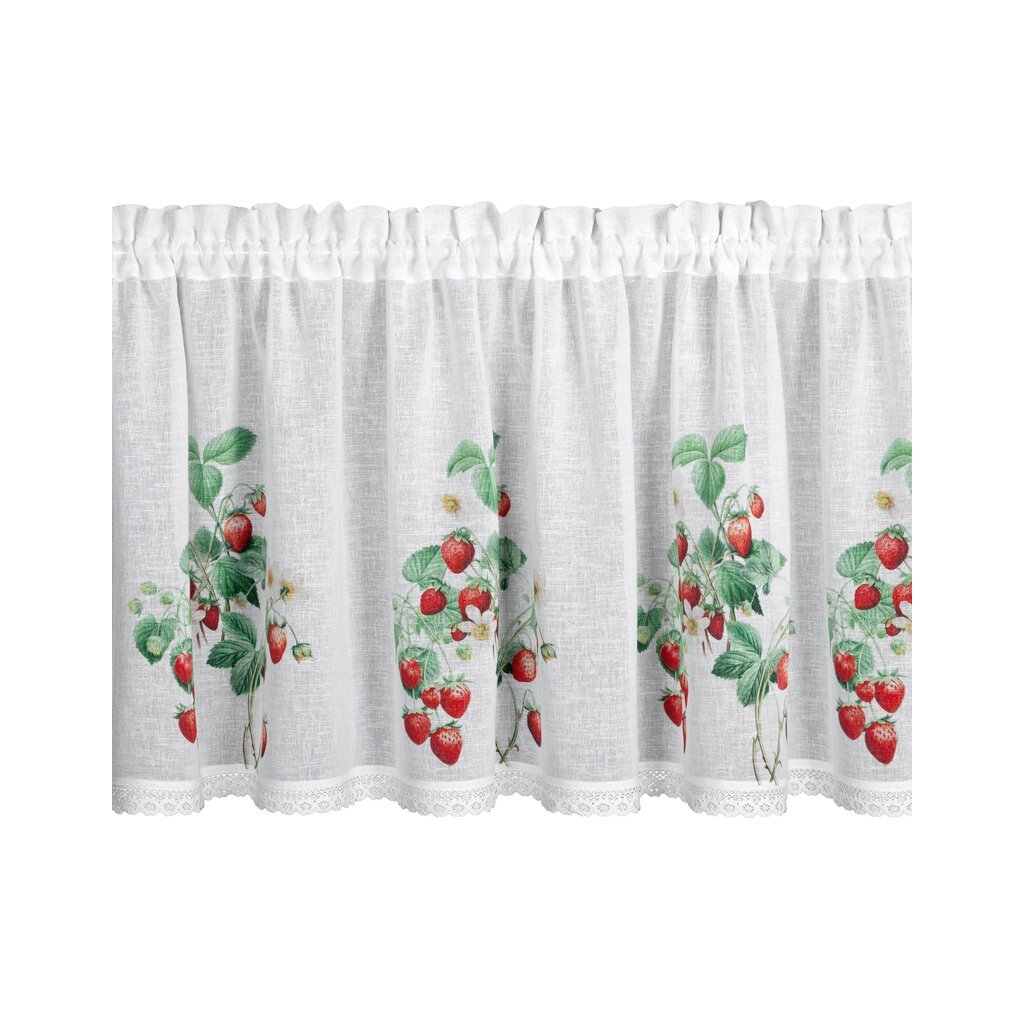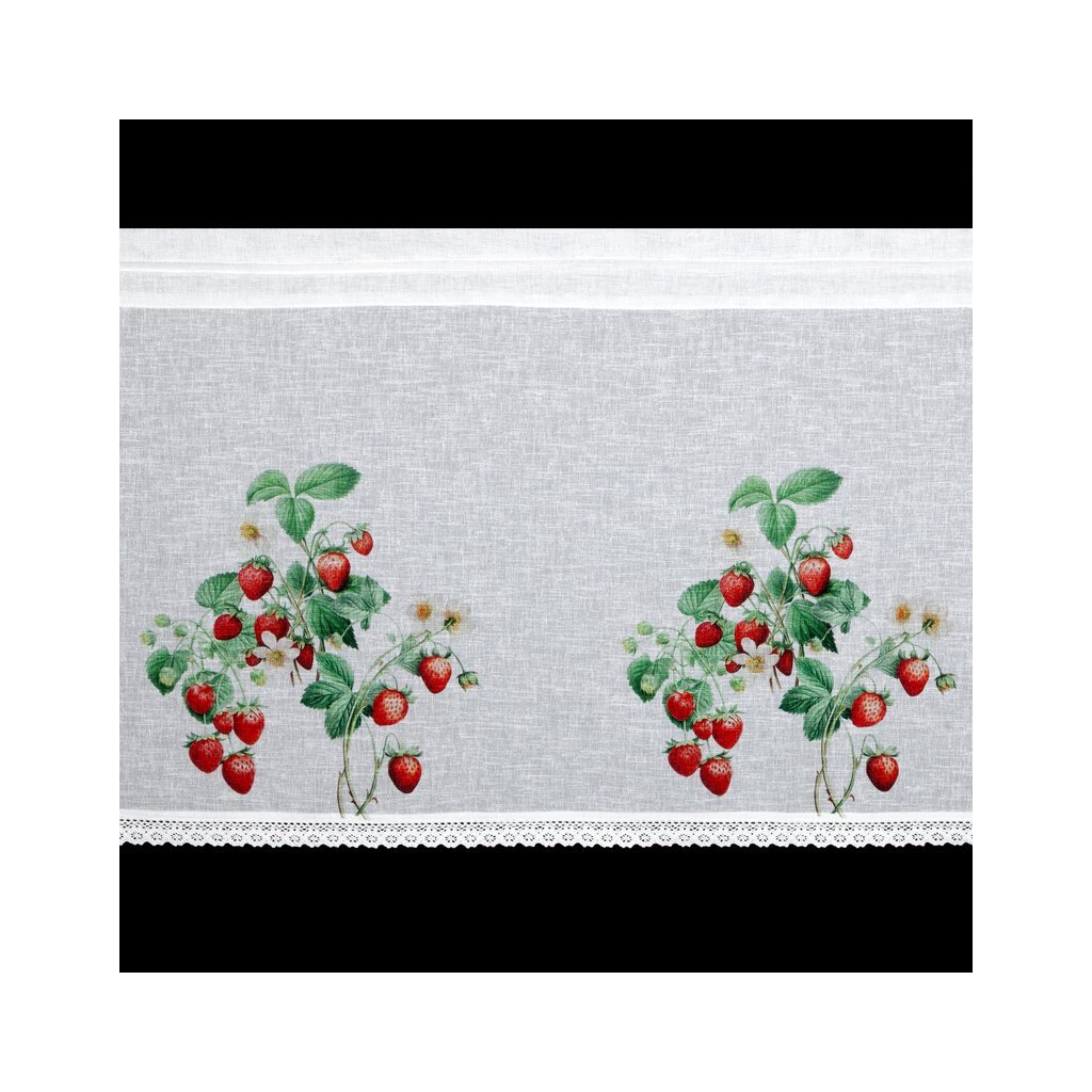 Bílá vitrážová záclona s potiskem jahod na tunelu KSENIA 150x60 cm