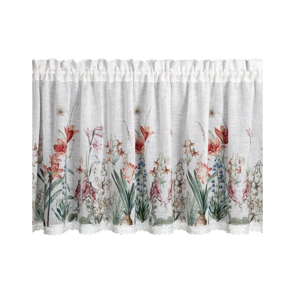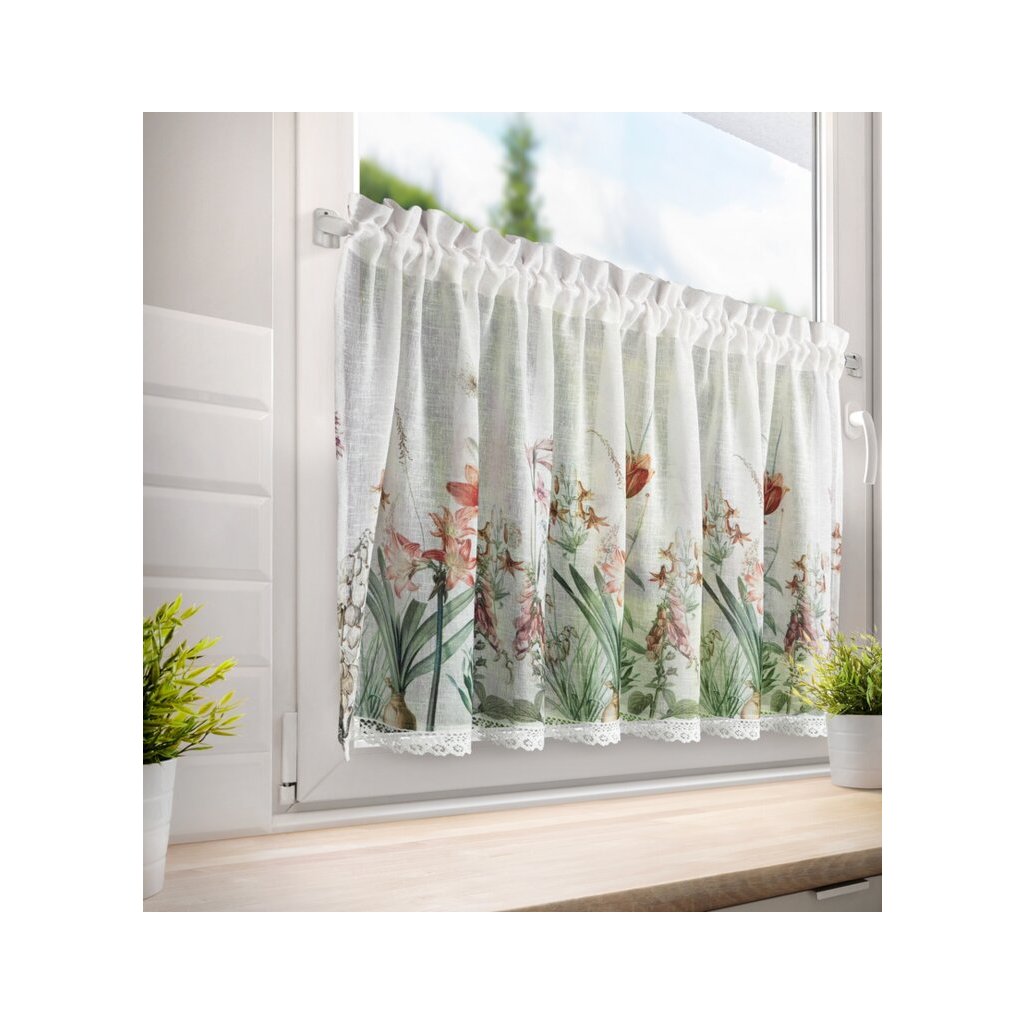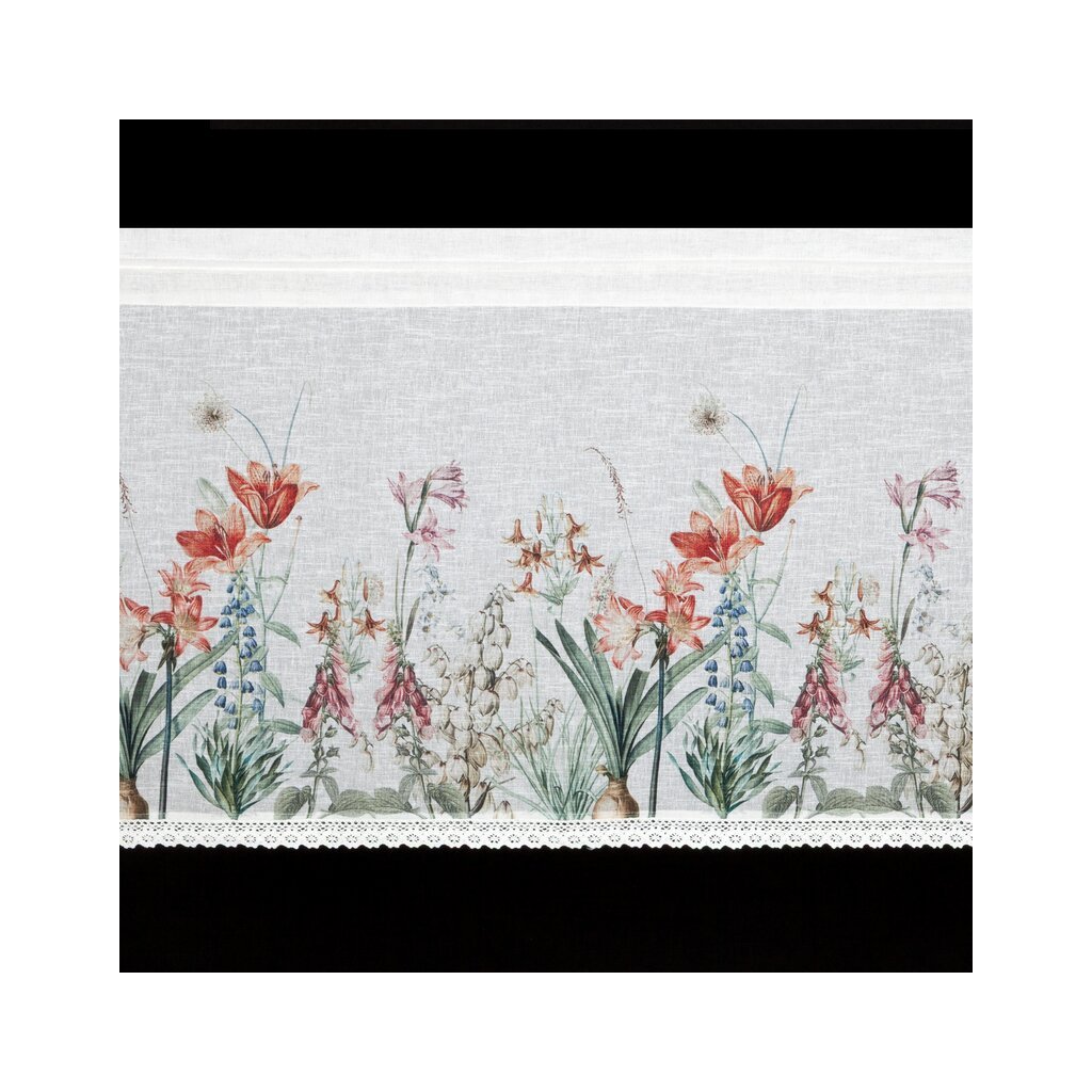 Bílá vitrážová záclona s potiskem letních květin na tunelu NEMEZJA 150x60 cm