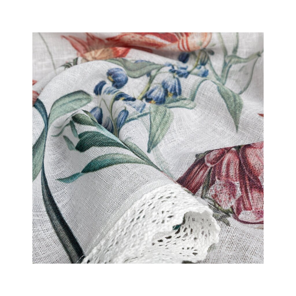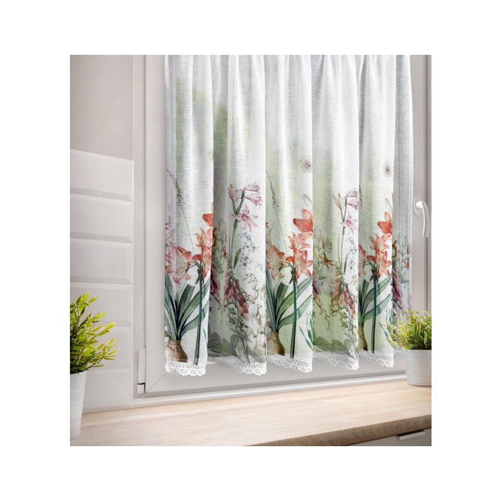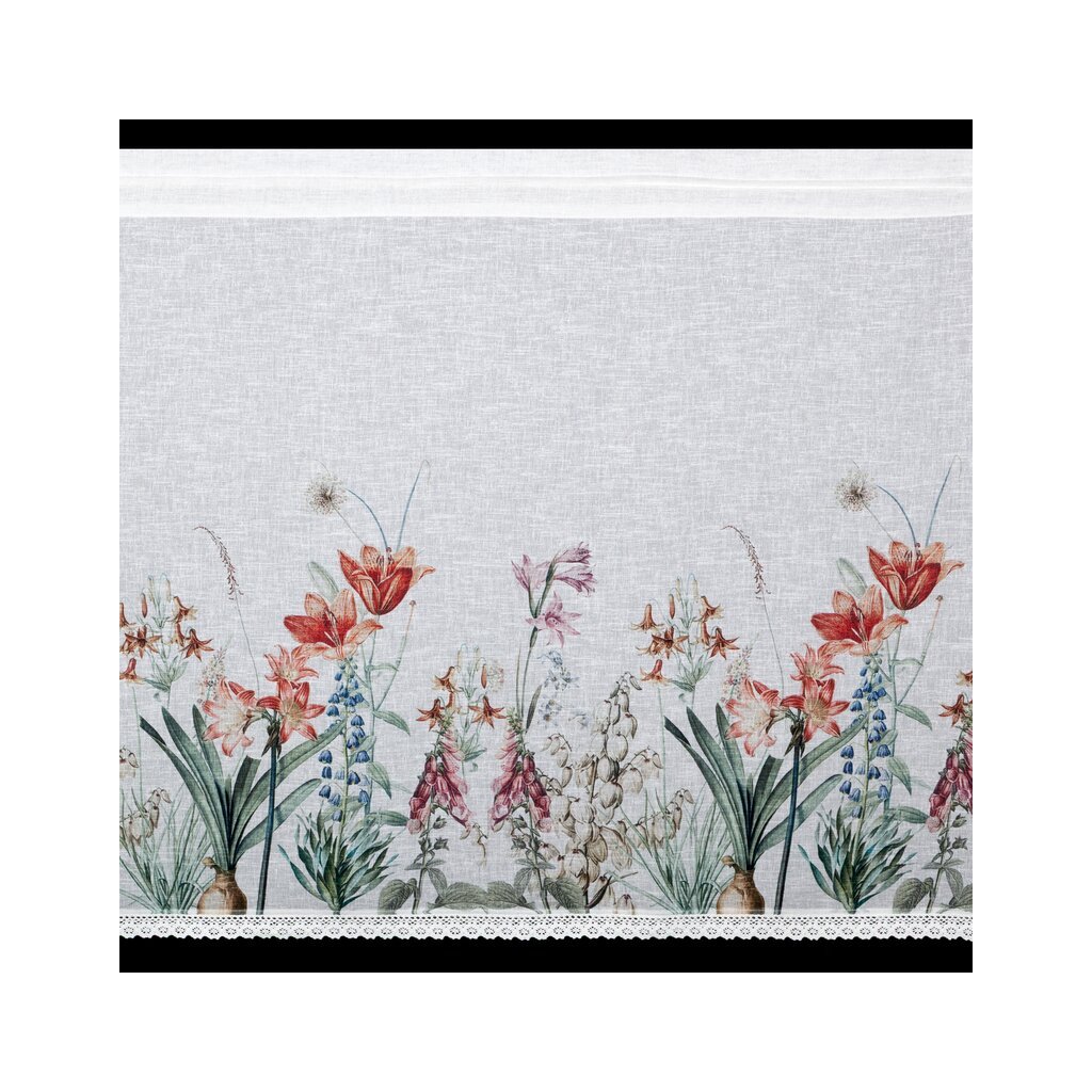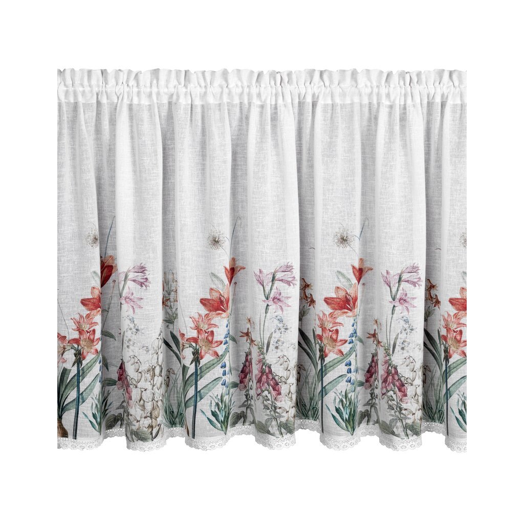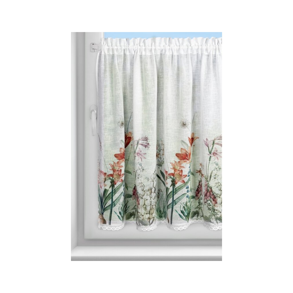 Bílá vitrážová záclona s potiskem letních květin na tunelu NEMEZJA 150x90 cm