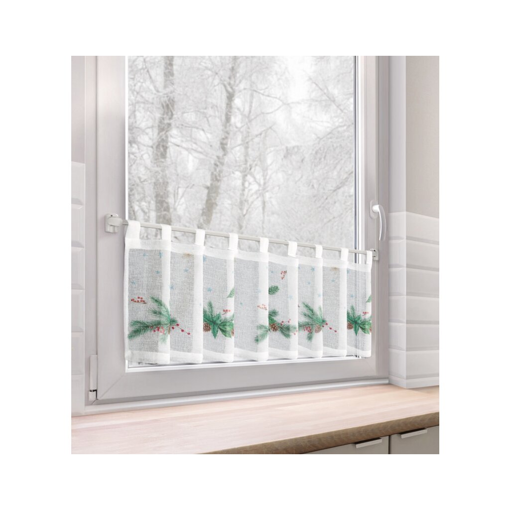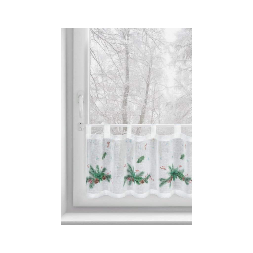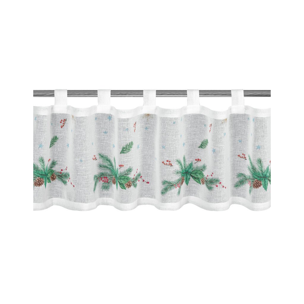 Bílá vitrážová záclona s potiskem vánočních větviček na ouškách XMAS 150x30 cm