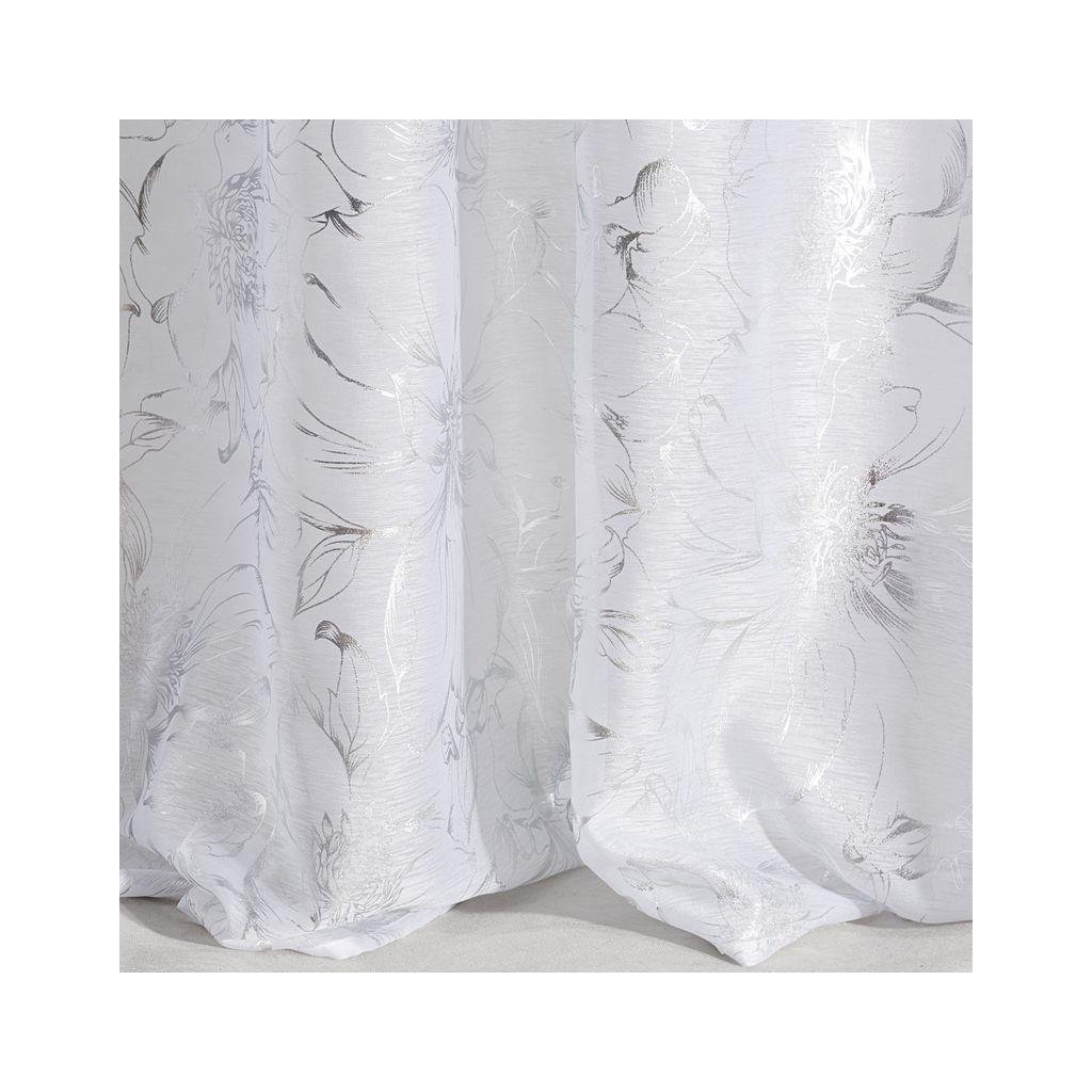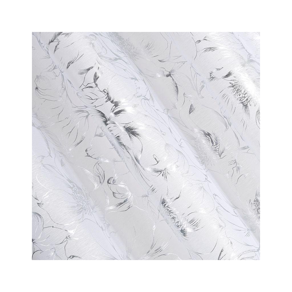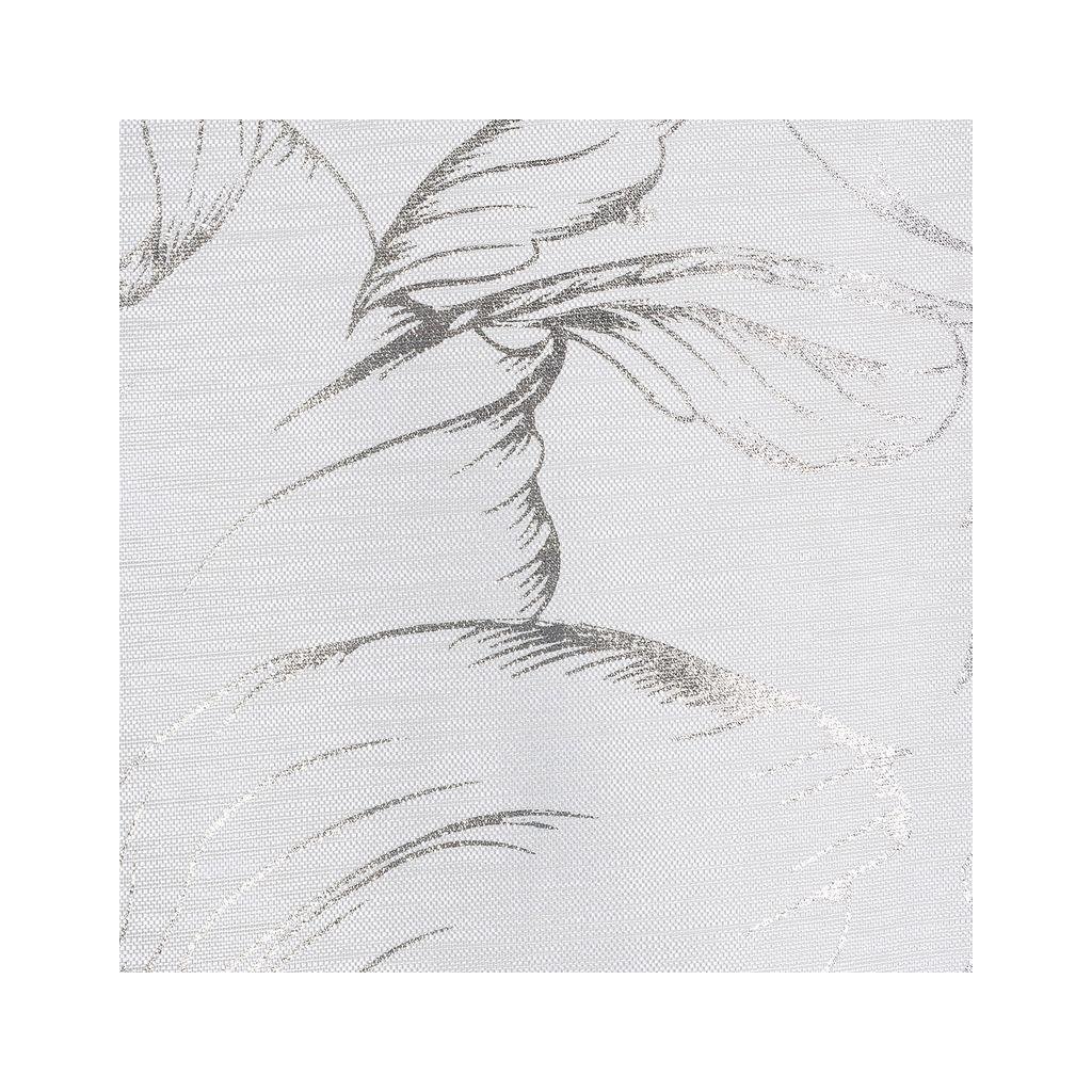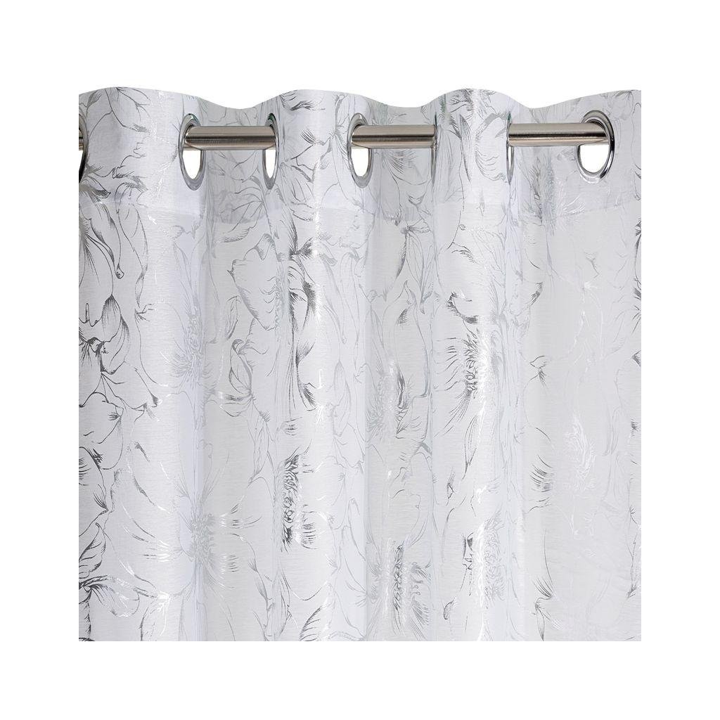 Stylová bílá záclona FEZA z lehkého a vzdušného materiálu s moderním stříbrným potiskem. Šířka: 140 cm, délka: 250 cm. Gramáž: 50 g/m2. Materiál: 100% polyester. Praktické zavěšení na kovových kroužcích.