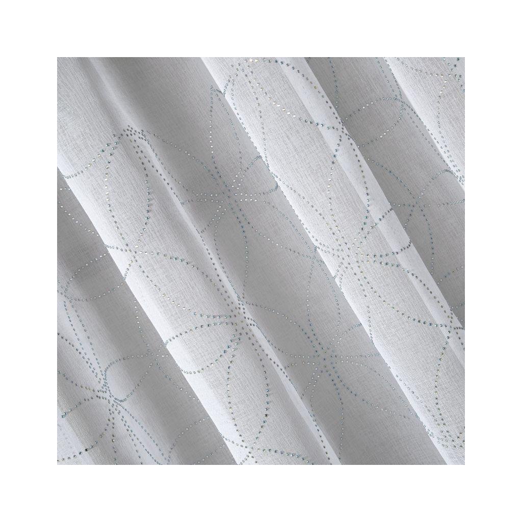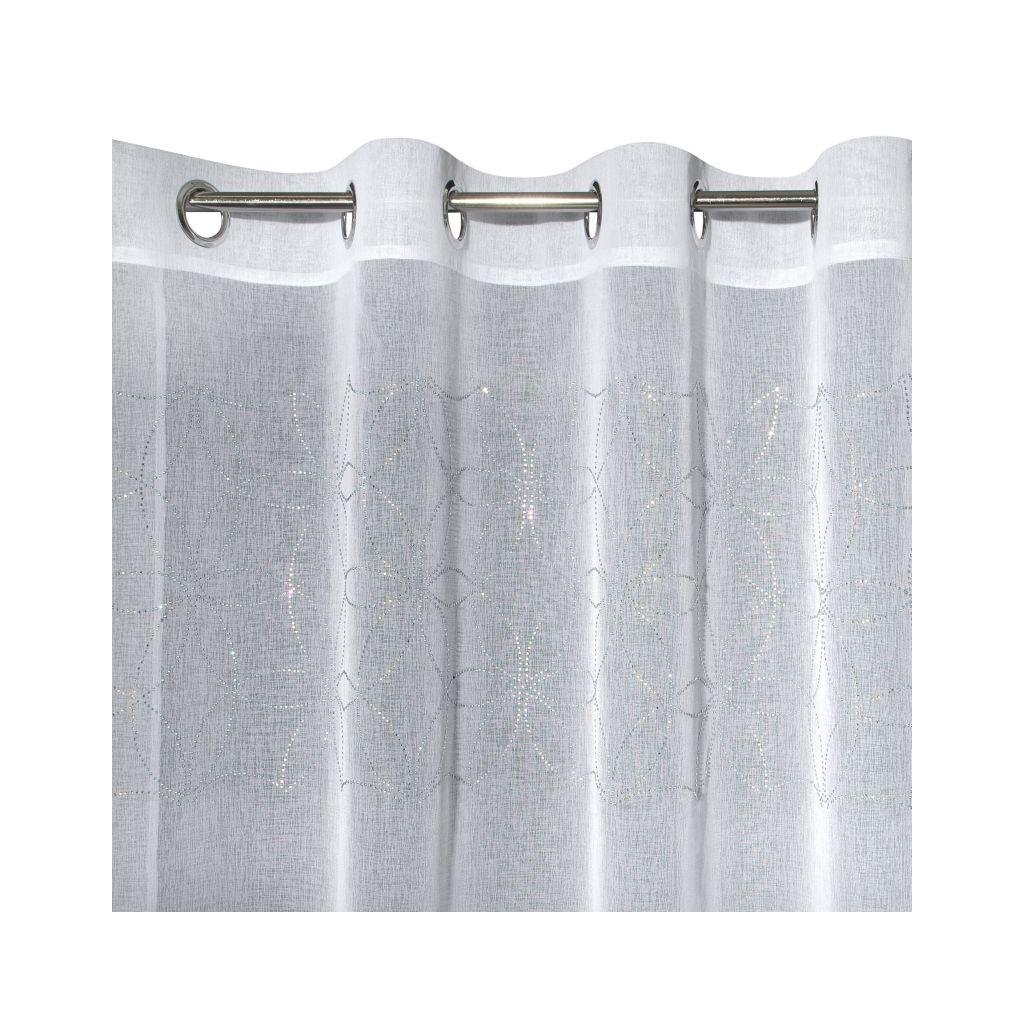 Hladká záclona bílé barvy z matné látky zdobená v horní části zirkonovým vzorem. Šířka: 140 cm, délka: 250 cm. Složení: 100% polyester. Snadné žehlení a praní. Praktické zavěšení na kovových kroužcích.