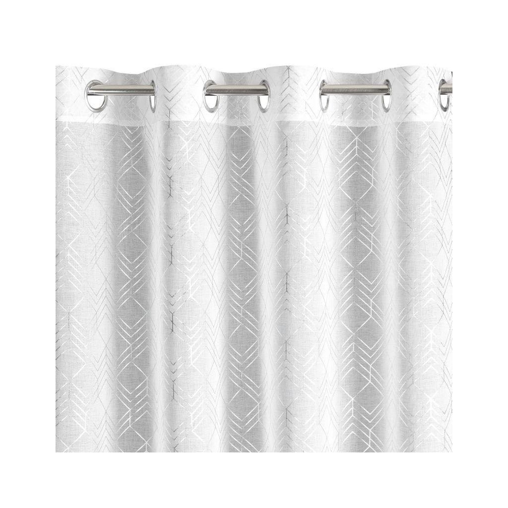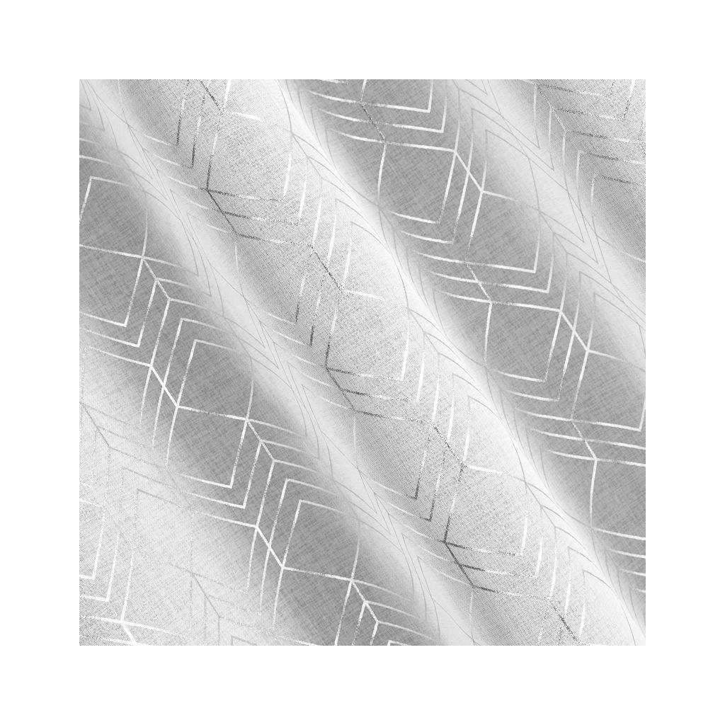 Jemná bílá záclona se stříbrným geometrickým vzorem. Šířka: 140 cm, délka: 250 cm. Složení: 100% polyester. Snadné žehlení a praní. Praktické zavěšení na kovových kroužcích.