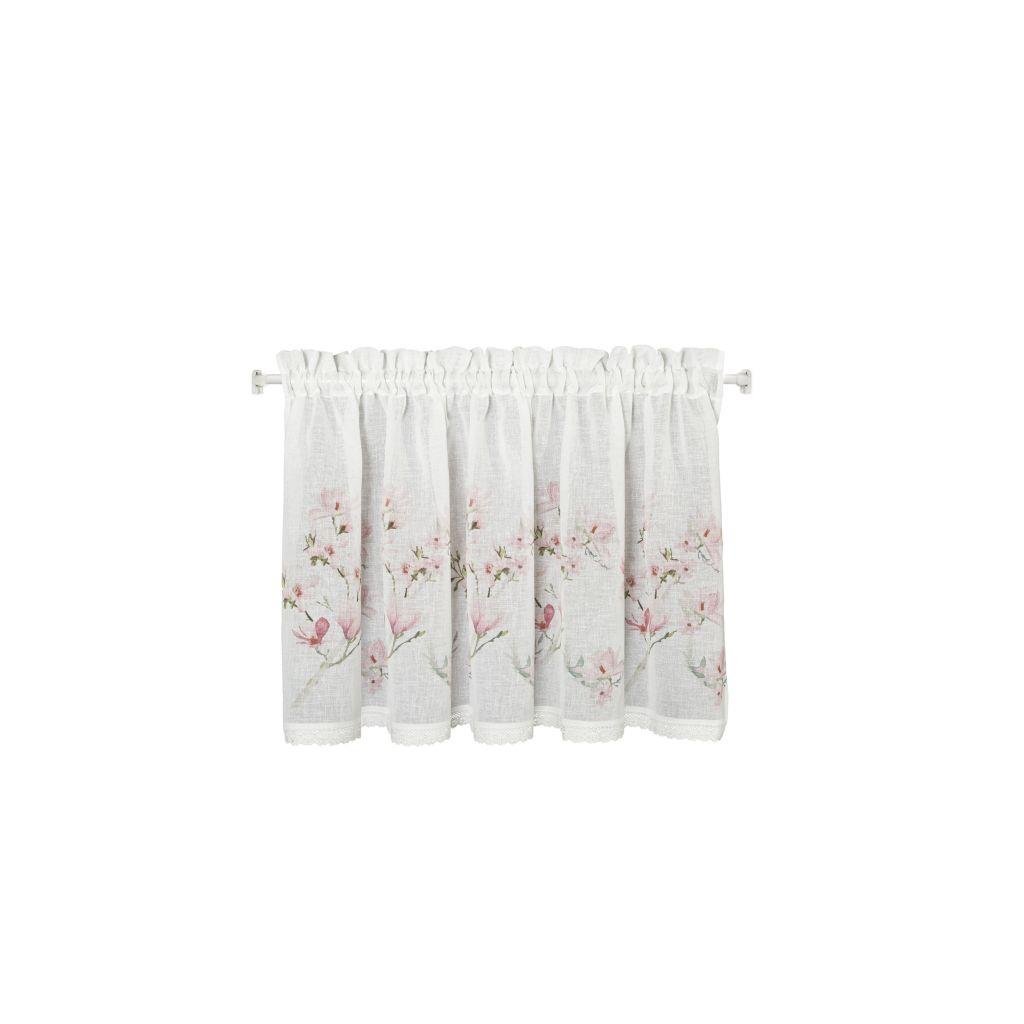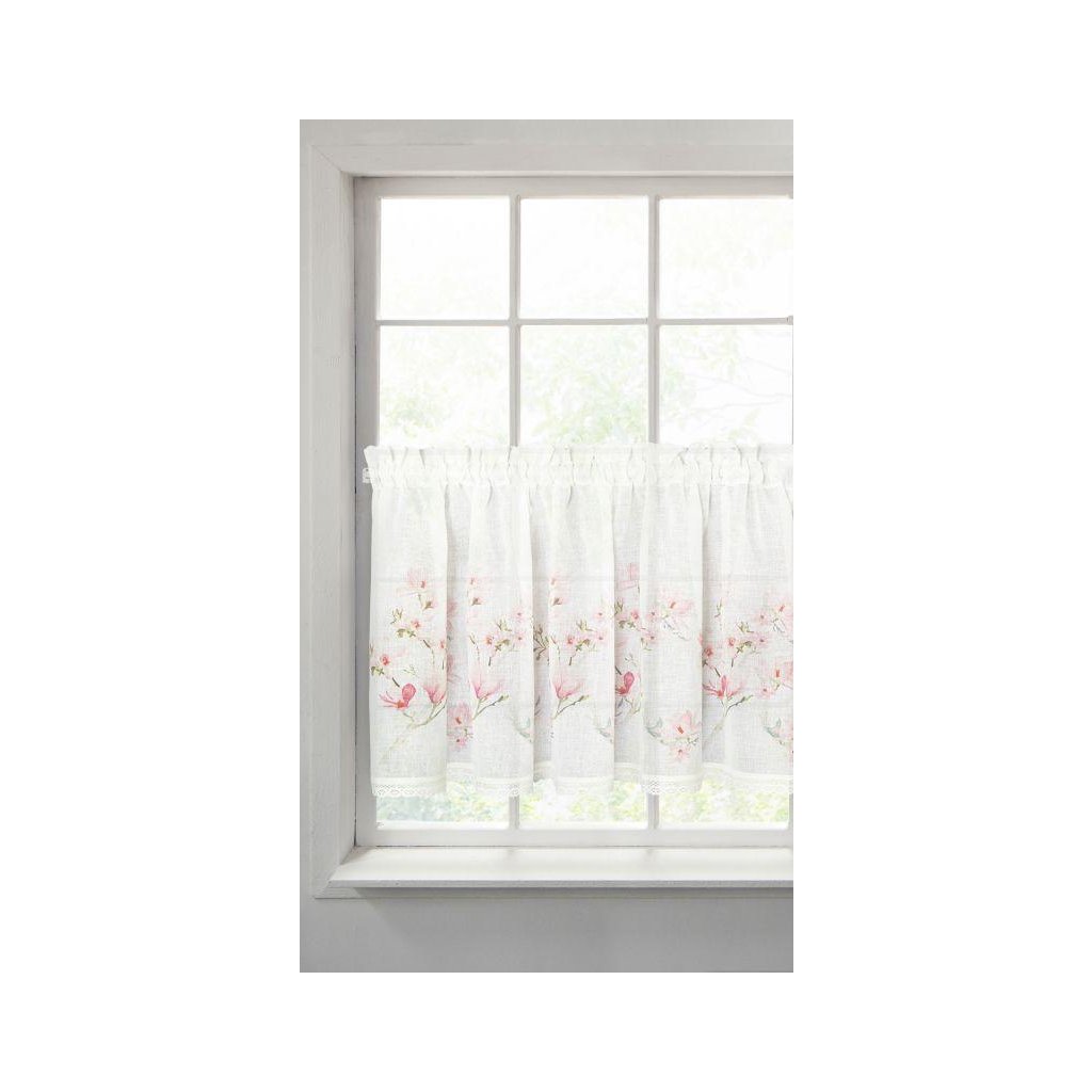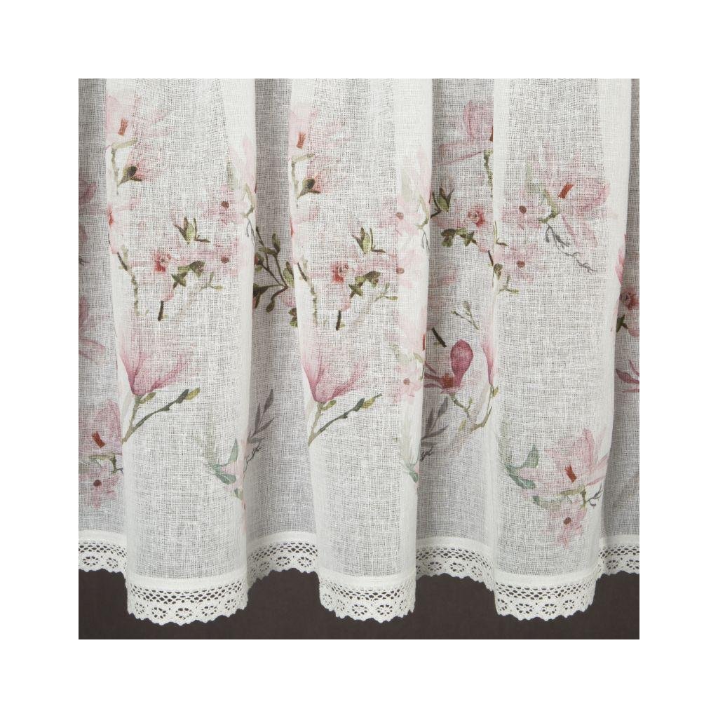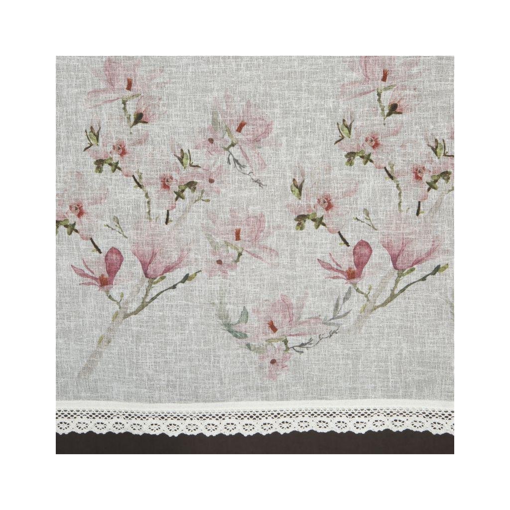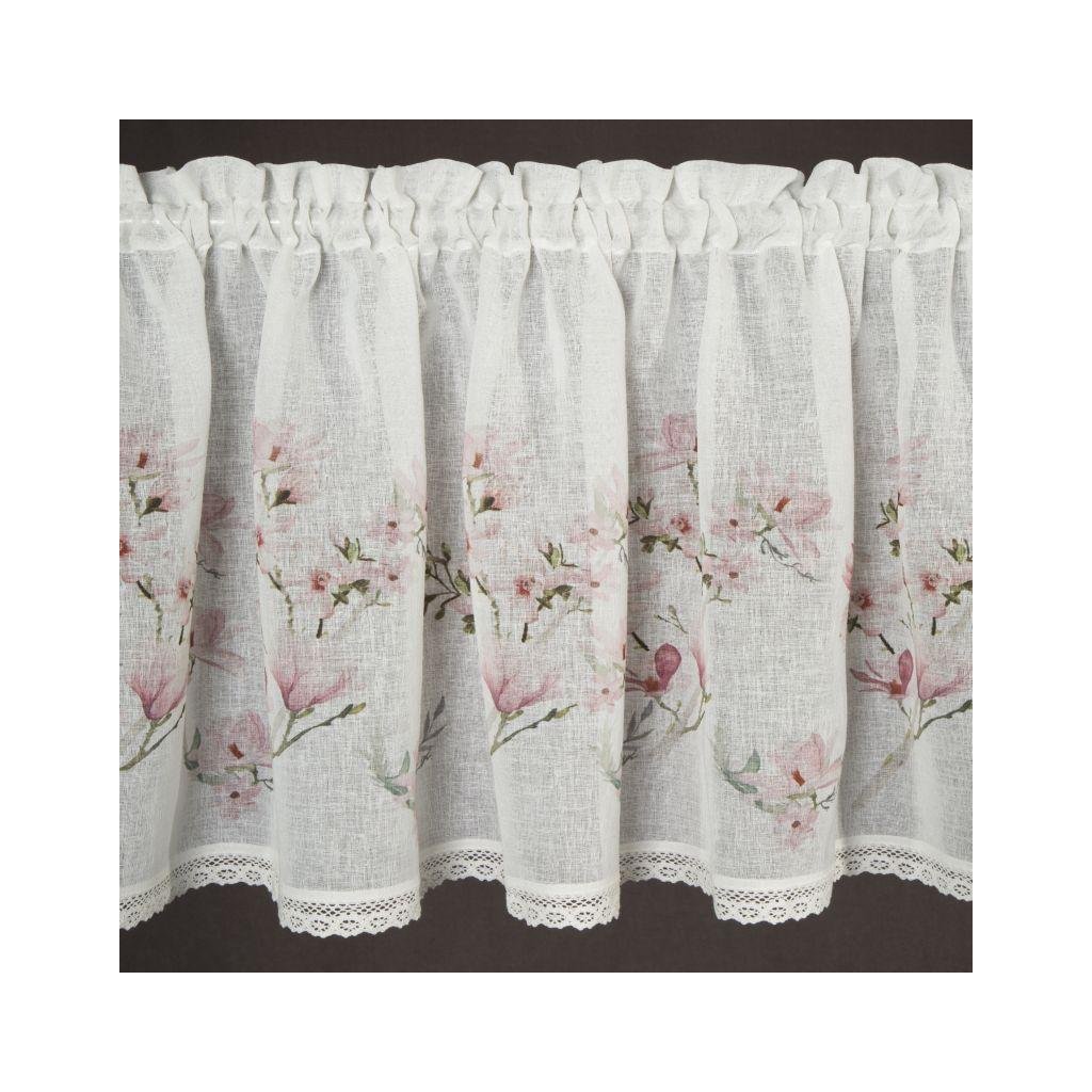 Bílá záclona v rustikálním stylu z etaminu zdobená vzorem magnólie a krajkou. Šířka: 150 cm, délka: 60 cm. Složení: 100% polyester. Lehké žehlení a praní. Praktické zavěšení na řasící pásce.