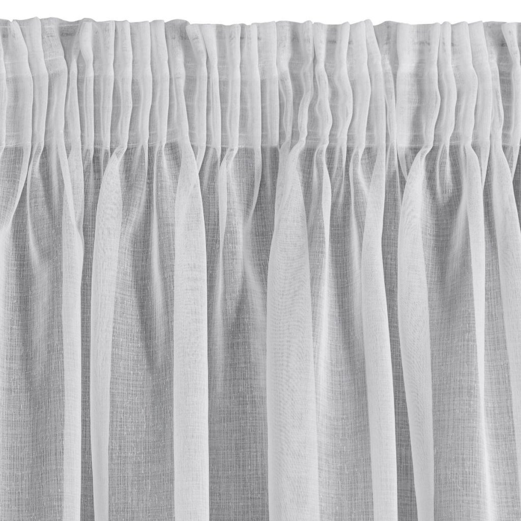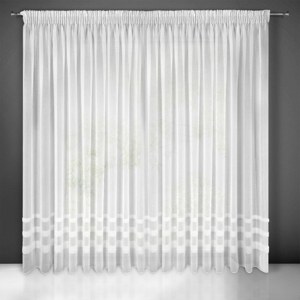 Jednobarevná bílá vzdušná záclona z etamínu, zdobená ve spodní části vodorovnými pruhy s přídavkem mohérové nitě. Šířka: 295 cm, délka: 250 cm. Složení: 100% polyester. Snadné žehlení a praní. Praktické zavěšení na řasící pásce.