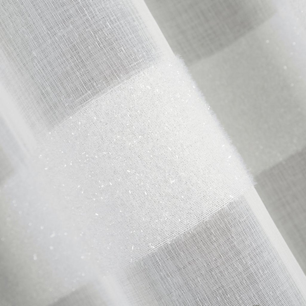 Krátká záclona ze světlého matného etamínu zdobená ve spodní části třemi lesklými pruhy mohérové nitě. Dekorace kombinuje glamour styl s ležérní elegancí. Záclona v sněhově bílé barvy interiér osvěžuje a její hustá struktura chrání interiér před nadměrným slunečním zářením, proto ji doporučujeme především do velmi slunečních místností. Můžete ji sladit s moderním, elegantním interiérem, s interiéry zařízenými v klasickém stylu, jakož i s ležérnějším stylem interiéru.Praktická řasící páska zaručí nádherný vzhled záclony.
