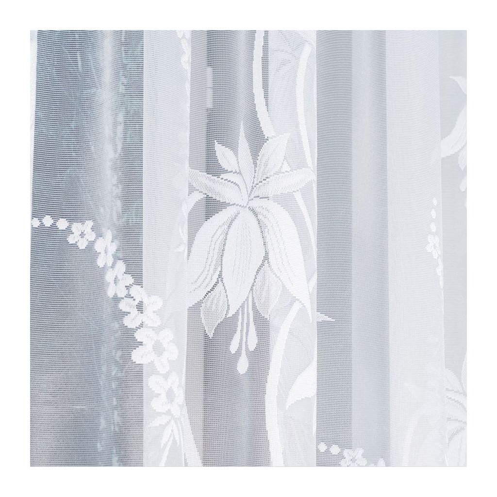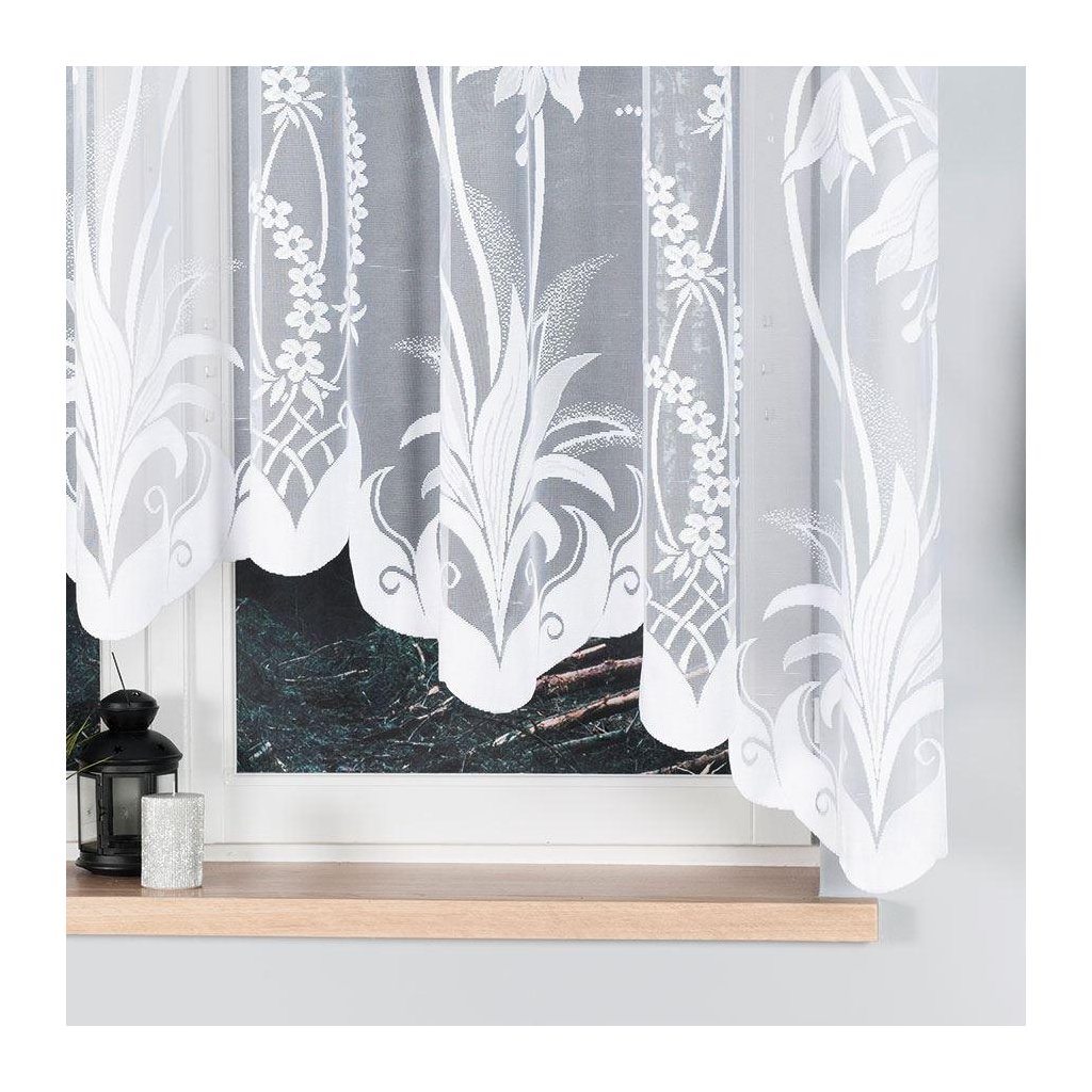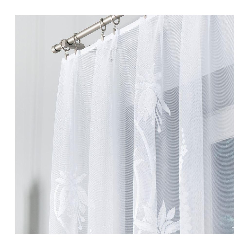 Dekor je propracovaný do nejmenšího detailu – jemné květinové a rostlinné motivy působí honosně, ale stále decentně. Vzor je rozmístěn tak, aby krásně orámoval výhled z okna a působil symetricky a harmonicky. Spodní okraj záclony je zakončen efektním obloukem, což dodává celé místnosti lehkost a svěží, upravený vzhled. Záclona krásně vynikne zejména v obýváku, ložnici nebo elegantní kuchyni .