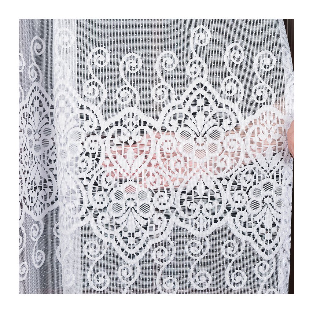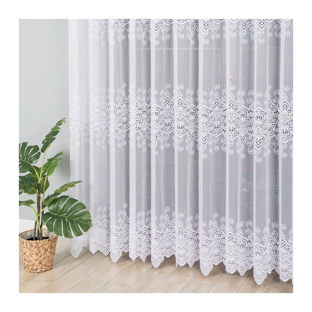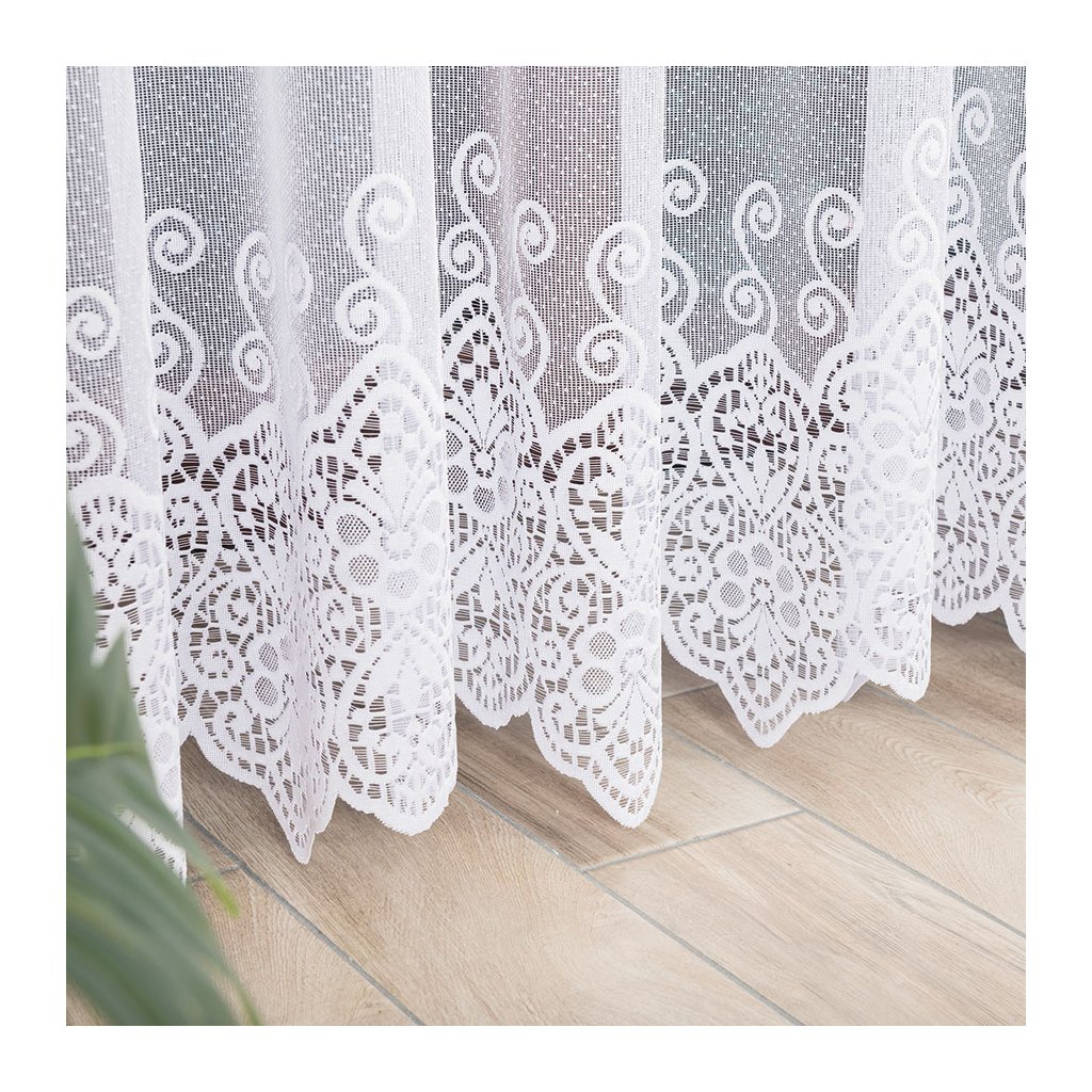 Vizuálním tahákem je dekorativní horizontální pás po ploše záclony: krajkové medailony s drobnými kvítky a točenými ornamenty vytvářejí působivou, ale stále jemnou texturu. Spodní okraj dotváří bohatý lem s obloučky , který okno nádherně orámuje a dodá mu reprezentativní vzhled . Design je nadčasový a snadno se kombinuje s moderním i klasickým zařízením.
