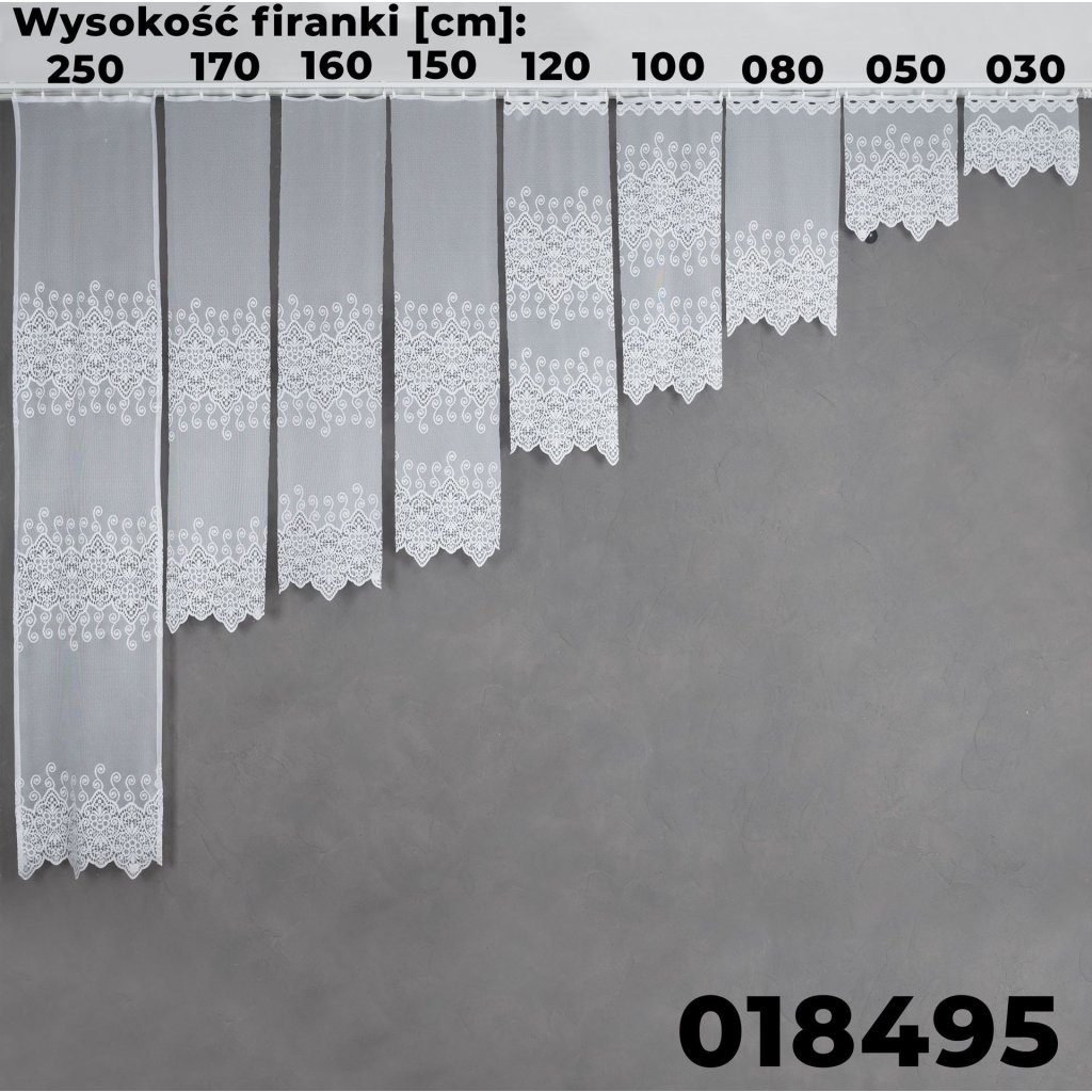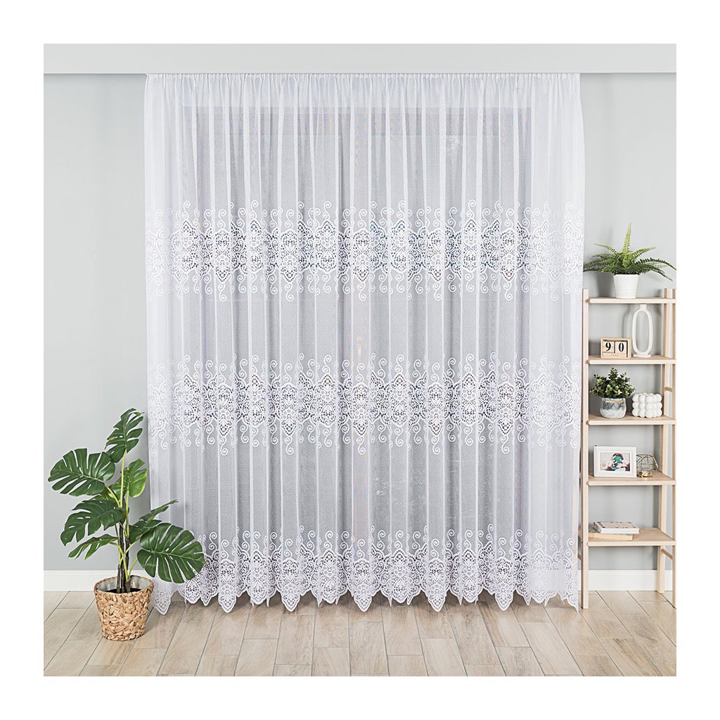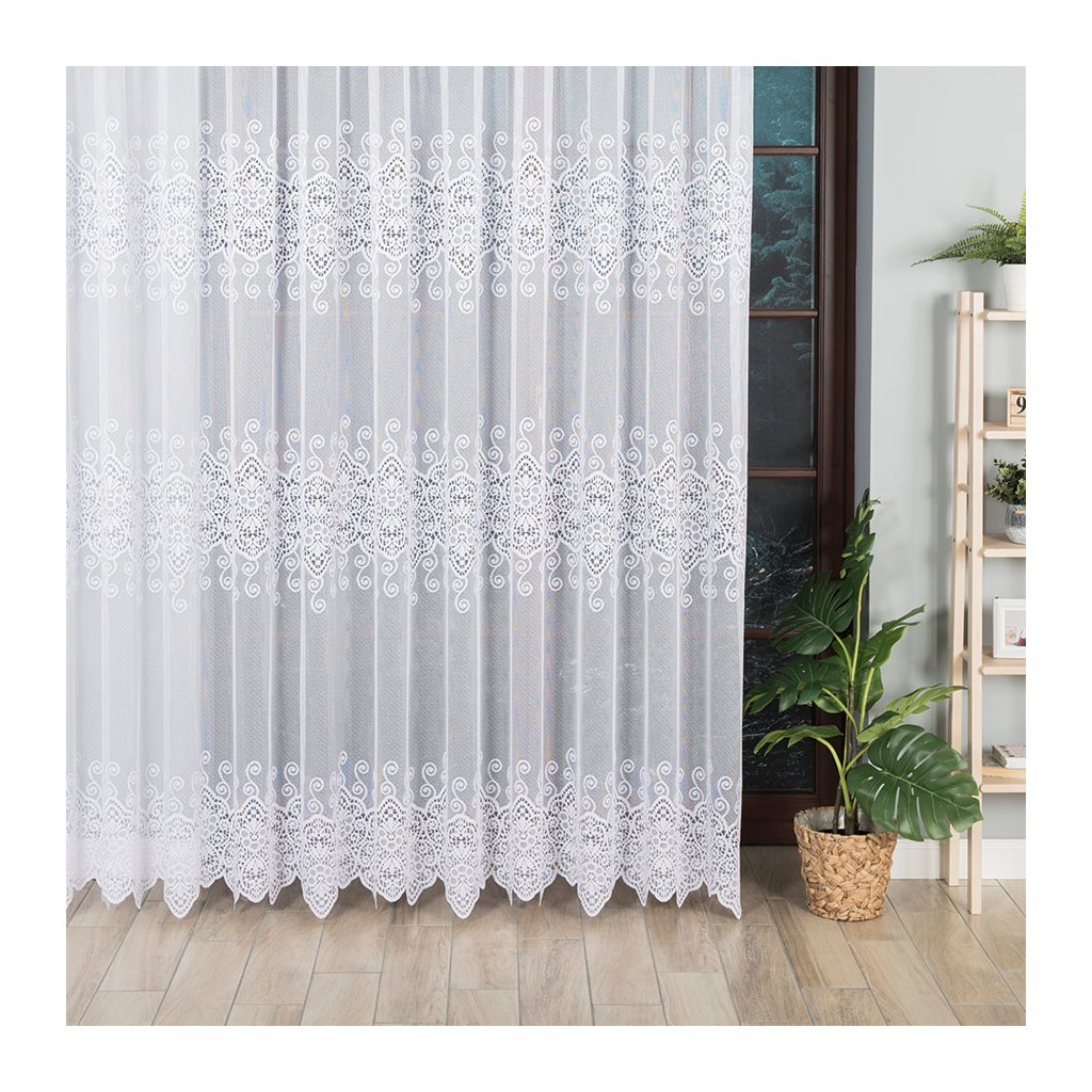 Vizuálním tahákem je dekorativní horizontální pás po ploše záclony: krajkové medailony s drobnými kvítky a točenými ornamenty vytvářejí působivou, ale stále jemnou texturu. Spodní okraj dotváří bohatý lem s obloučky , který okno nádherně orámuje a dodá mu reprezentativní vzhled . Design je nadčasový a snadno se kombinuje s moderním i klasickým zařízením.