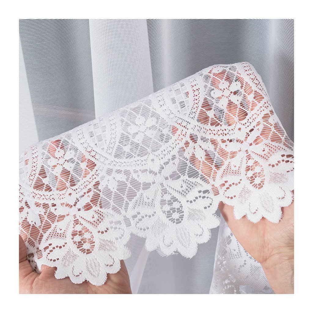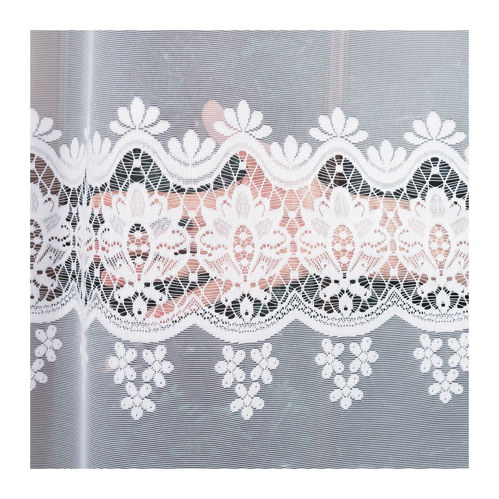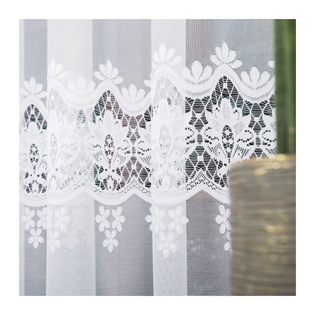 Hlavním prvkem je zajímavý horizontální pás s bohatým vzorem – propojené kvítky a jemné krajkové motivy vytvářejí na okně dekorativní linii. Spodní hranu dotváří ornamentální lem se zdobenými obloučky , který okno krásně orámuje a dodá mu reprezentativní vzhled . Design je nadčasový a snadno se kombinuje s moderním i klasickým zařízením.