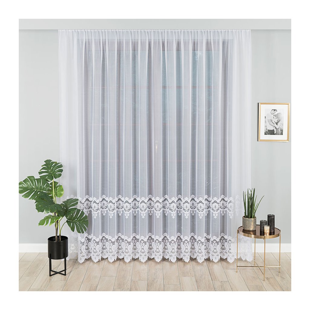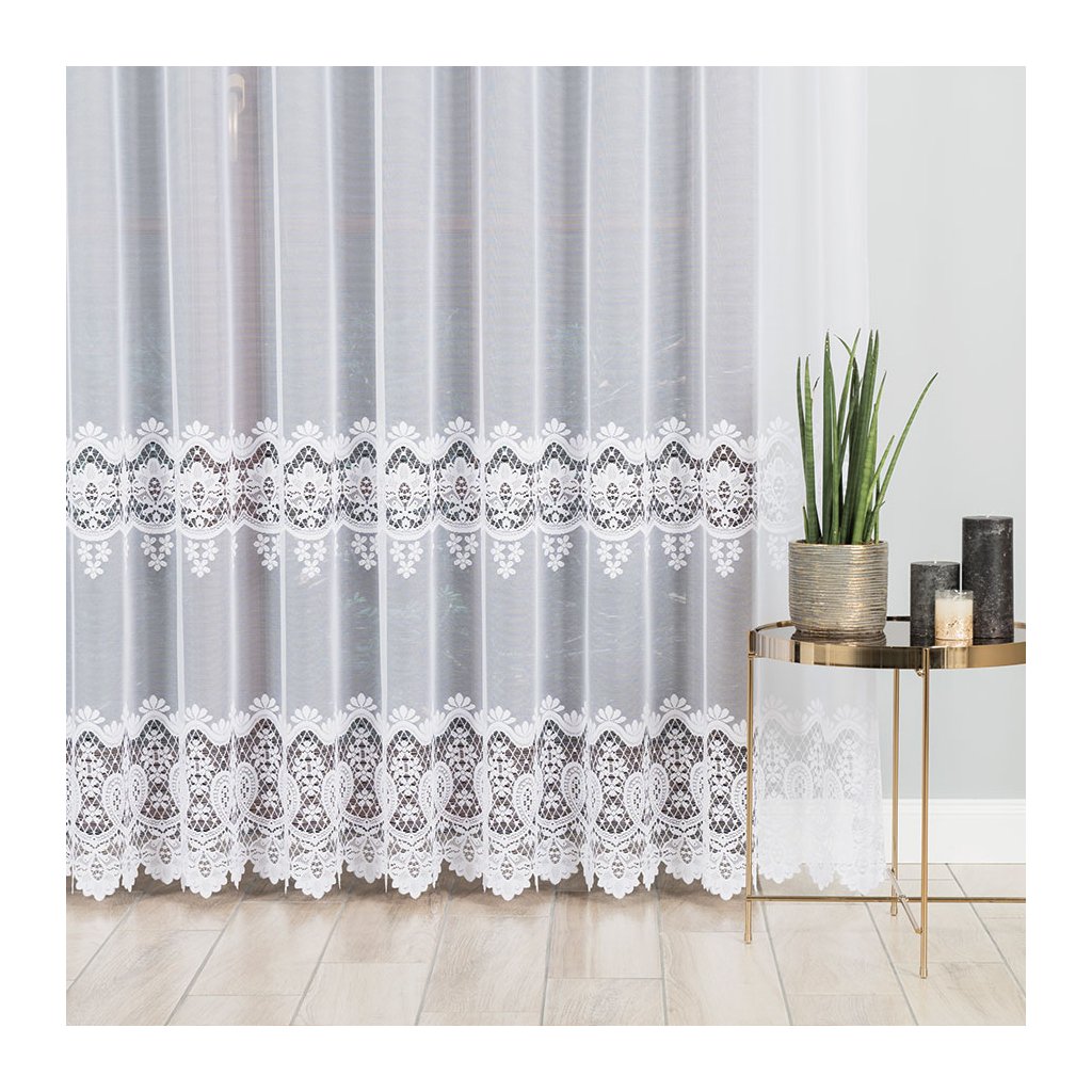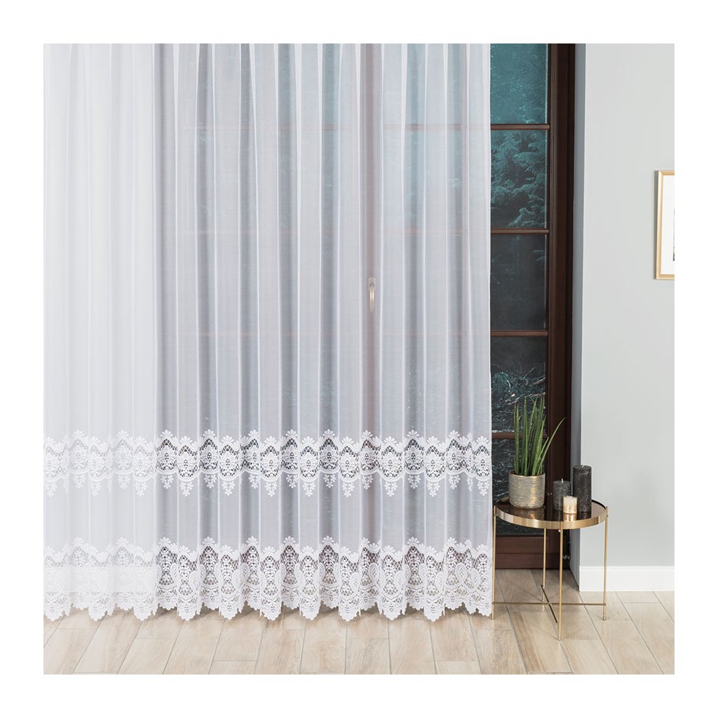 Hlavním prvkem je zajímavý horizontální pás s bohatým vzorem – propojené kvítky a jemné krajkové motivy vytvářejí na okně dekorativní linii. Spodní hranu dotváří ornamentální lem se zdobenými obloučky , který okno krásně orámuje a dodá mu reprezentativní vzhled . Design je nadčasový a snadno se kombinuje s moderním i klasickým zařízením.