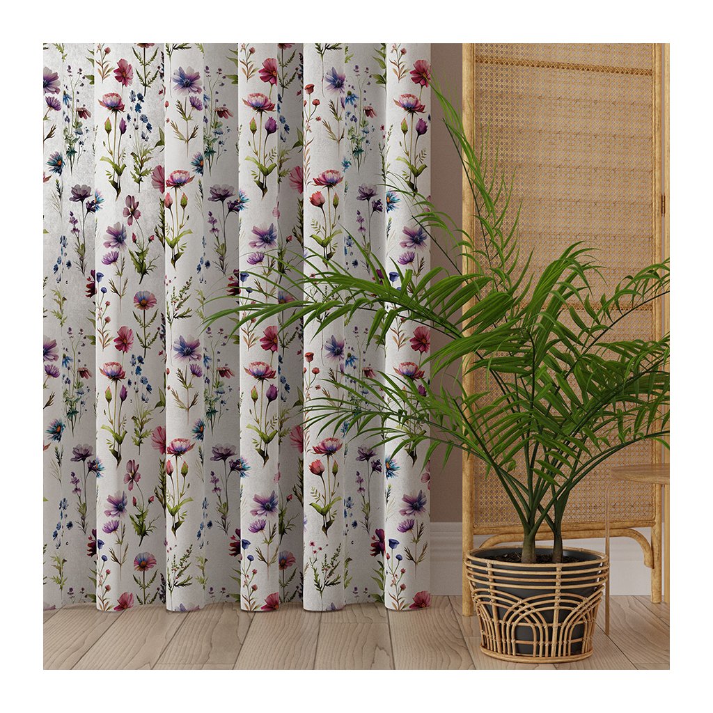 Závěs zdobí barevný vzor polních květin v odstínech fialové, růžové, modré a zelené, který působí optimisticky a hravě . Díky bílému podkladu působí interiér světle a vzdušně .