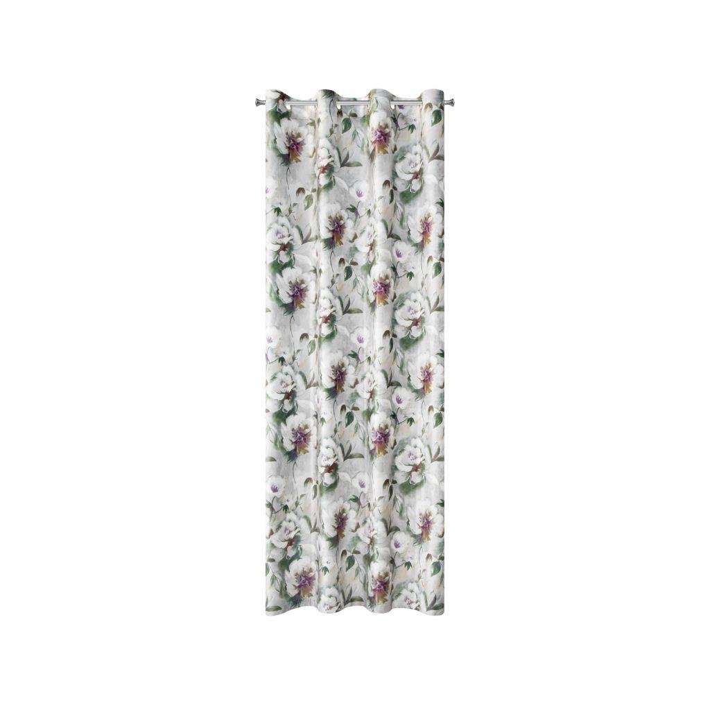 Závěs bílé barvy z jemného sametu s matným povrchem. Módní květinový vzor. Šířka: 140 cm, délka: 250 cm. Složení: 100% polyester. Snadné žehlení. Praktické zavěšení na kovových kroužcích.
