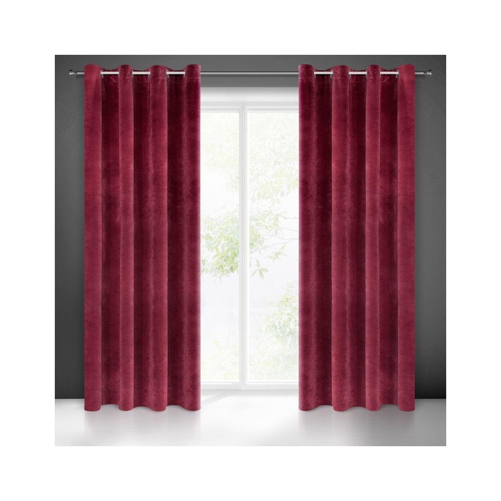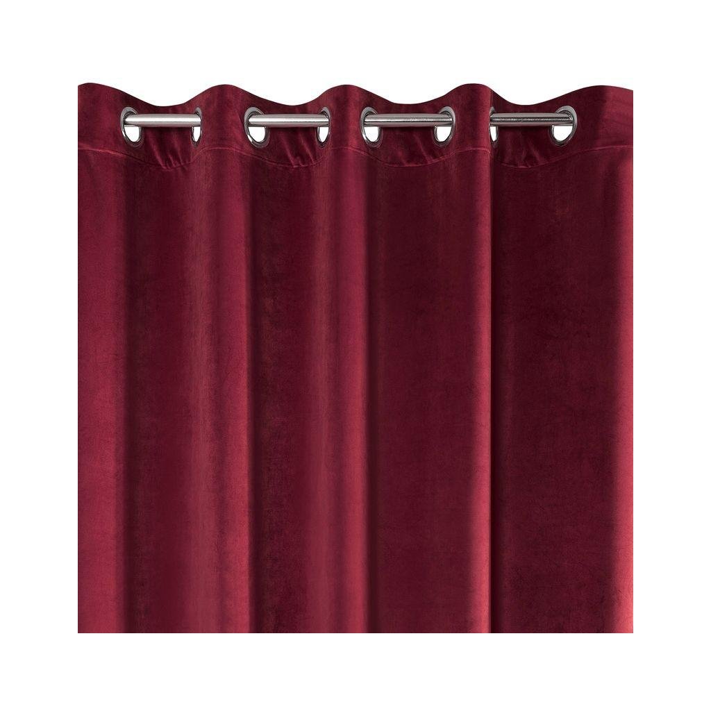 Sametový jednobarevný bordový závěs RIA. Masivní látka poskytuje vysoký stupeň vnitřního zatemnění. Šířka: 140 cm, délka: 250 cm. Složení: 100% polyester. Gramáž 290 g / m2. Praktické zavěšení na kovových kroužcích.