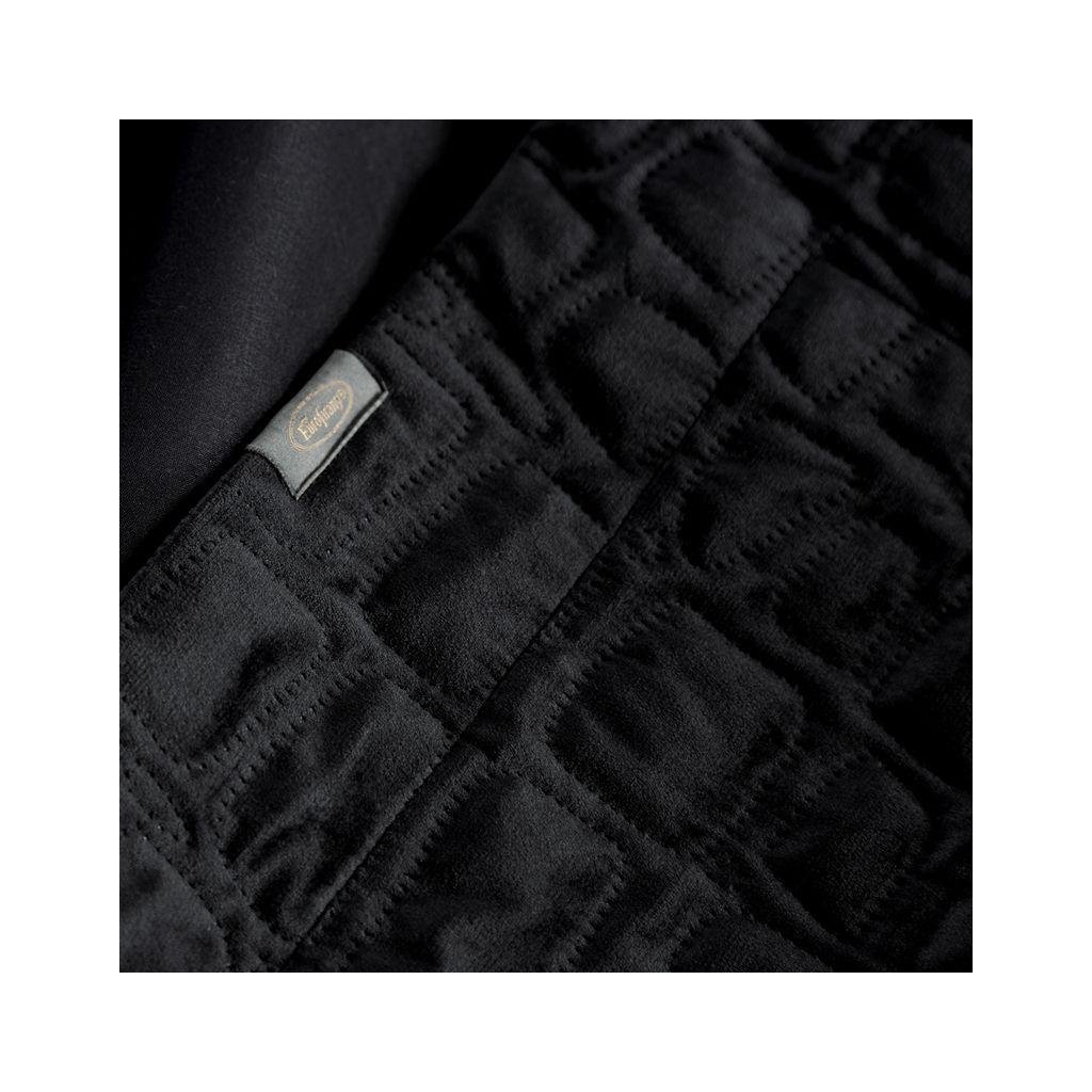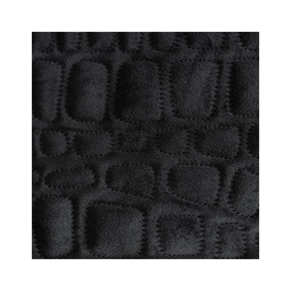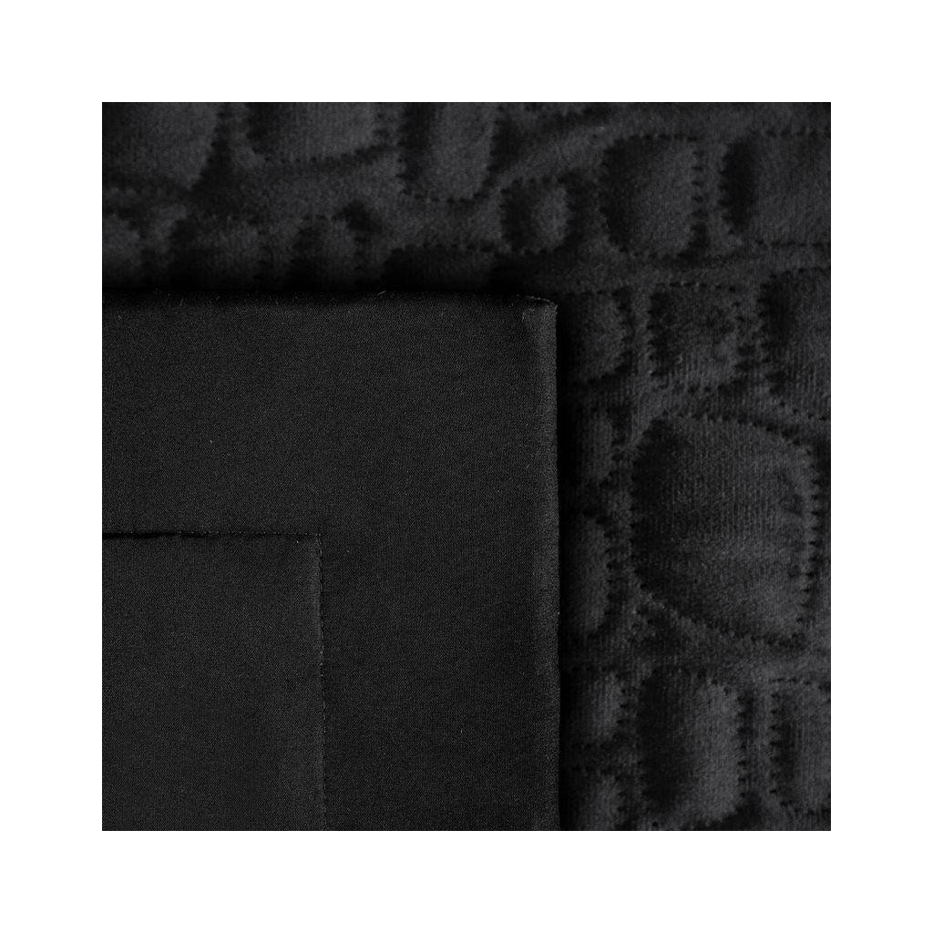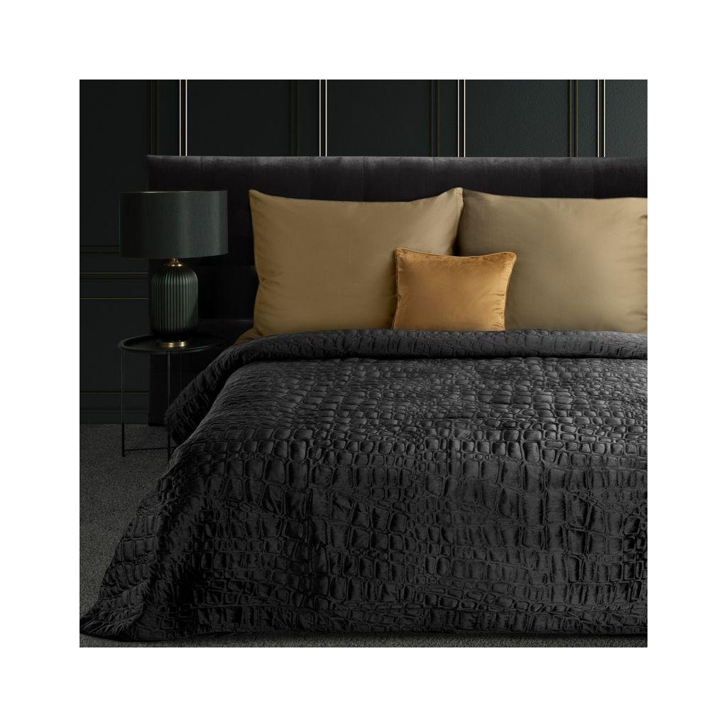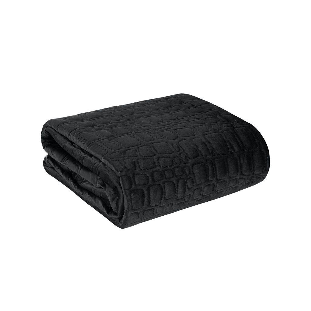 Moderní černý sametový přehoz na postel z kolekce SALVIA7 vyrobený technikou hot press – lisováním za tepla s motivem krokodýlí kůže. Šířka: 220 cm, délka: 240 cm. Gramáž: 200 (nahoru) +120 (výplň) +70 (dolů) g/m2. Materiál: 100% polyester - samet.