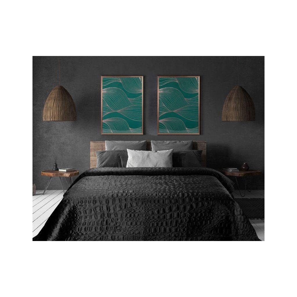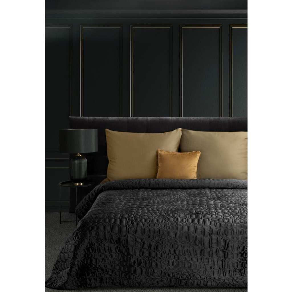 Nádherný černý přehoz na postel SALVIA7 vyrobený technikou lisování za tepla s motivem krokodýlí kůže, dodává interiéru ložnice moderní styl. Měkký sametový povrch přehozu je vyroben z ušlechtilé a kvalitní látky s mírným leskem, přičemž spodní strana je vyrobena z matného mikrovlákna, které zabraňuje sesmeknutí přehozu z povlečení. Díky pružné výplni umístěné mezi dvěma tkaninami přehoz jemně obepíná postel a zaručí vám estetický vzhled ložnice. Moderní způsob výroby pomocí tepelného svařování (bez použití nití) zvyšuje pevnost materiálu a zajišťuje delší životnost přehozu. Přehoz na postel je praktický způsob, jak udržet v ložnici pořádek a udržet ložní prádlo déle svěží. Vyberte si z dostupných barev a velikostí, užijte si jedinečné prostředí ložnice.