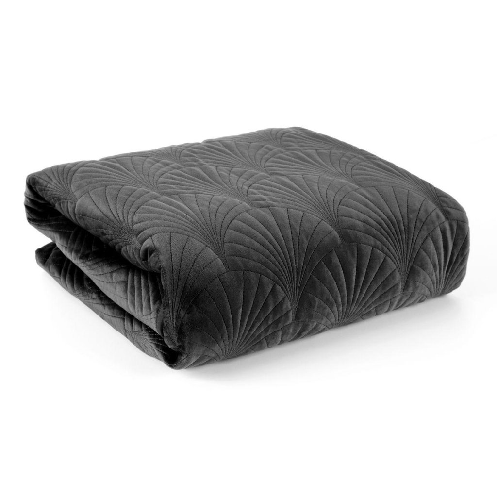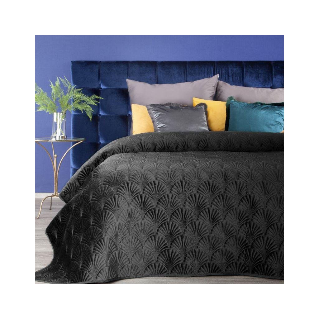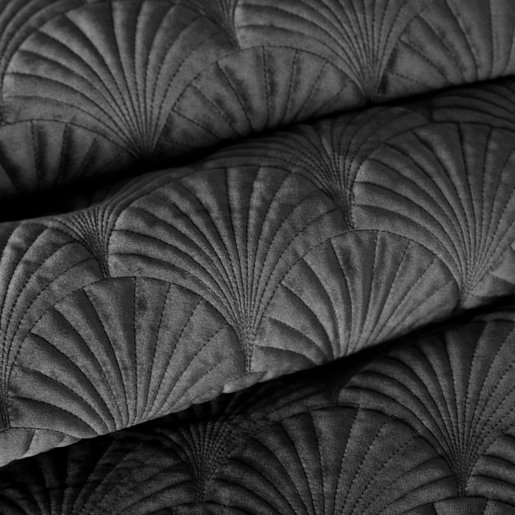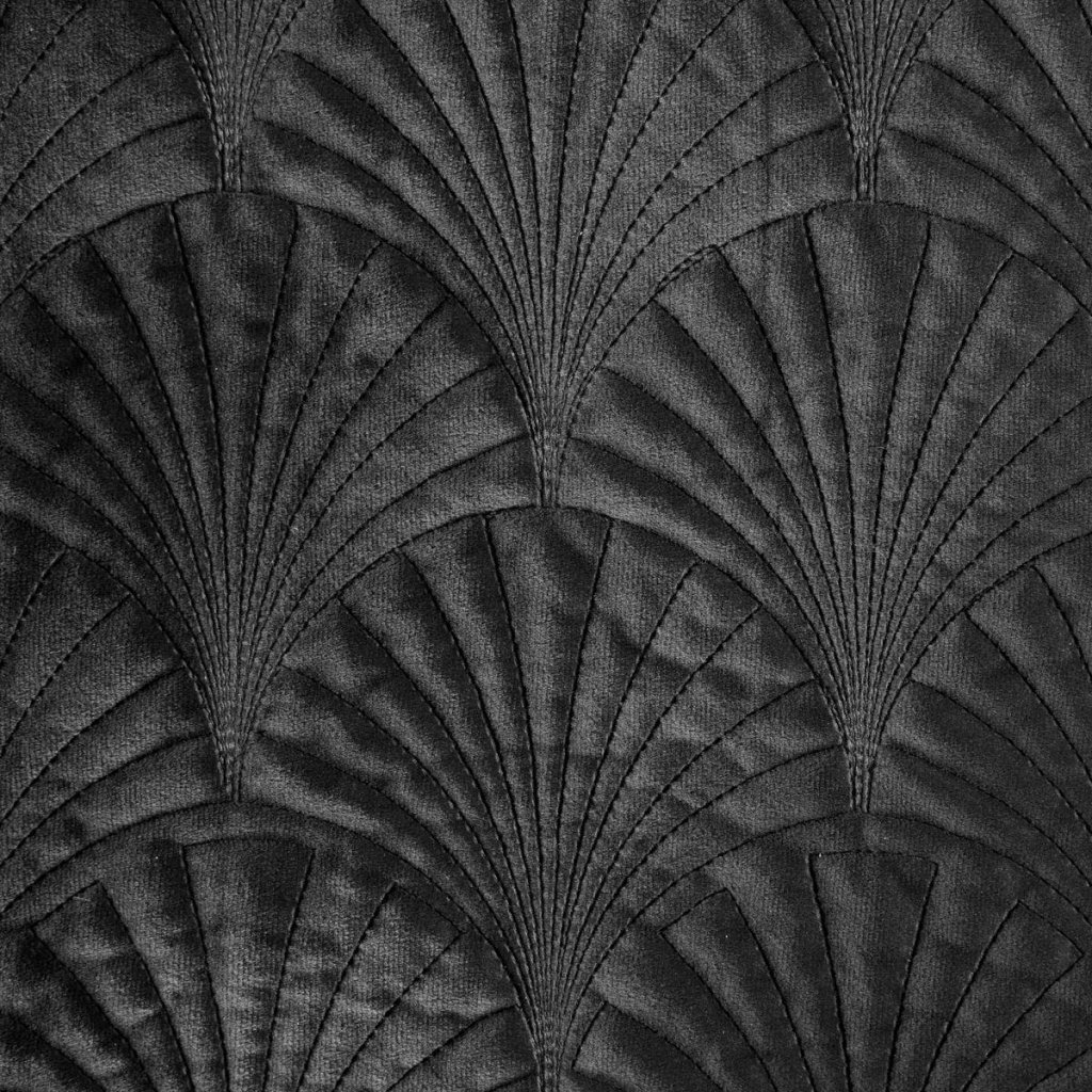 Lesklý sametový přehoz černé barvy prošívaný tradiční metodou se vzorem malých vějířů ve stylu art deco. Lze prát v pračce. 170x210 cm