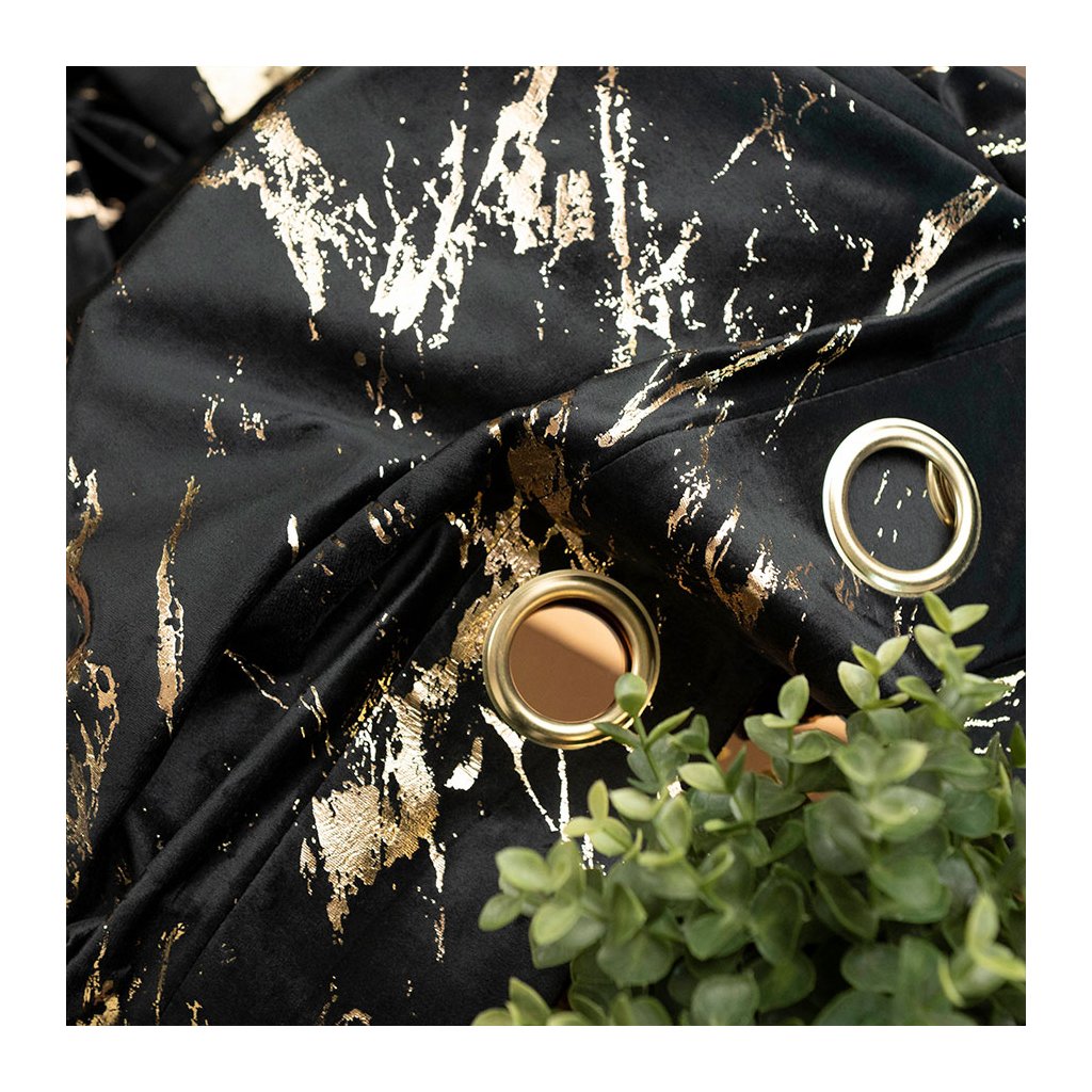 Černý sametový závěs se zlatým potiskem na kroužcích MARMA 140x250 cm