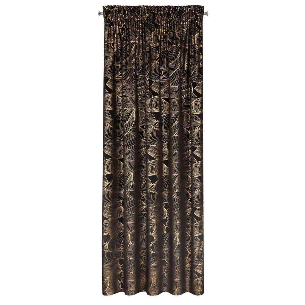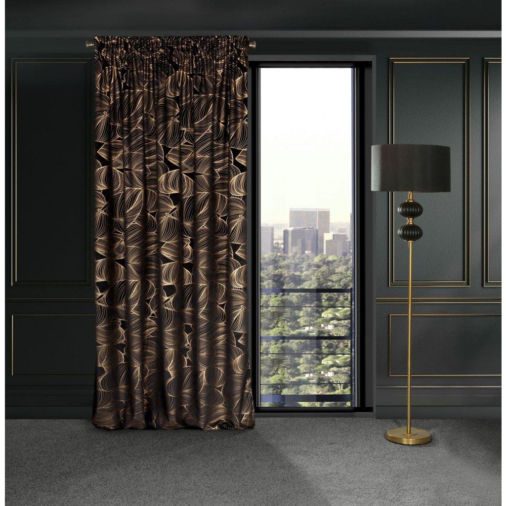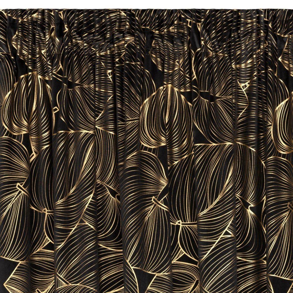 Černý zatemňovací závěs na pásce VICTORIA s motivem zlatých listů leknínu 140x270 cm