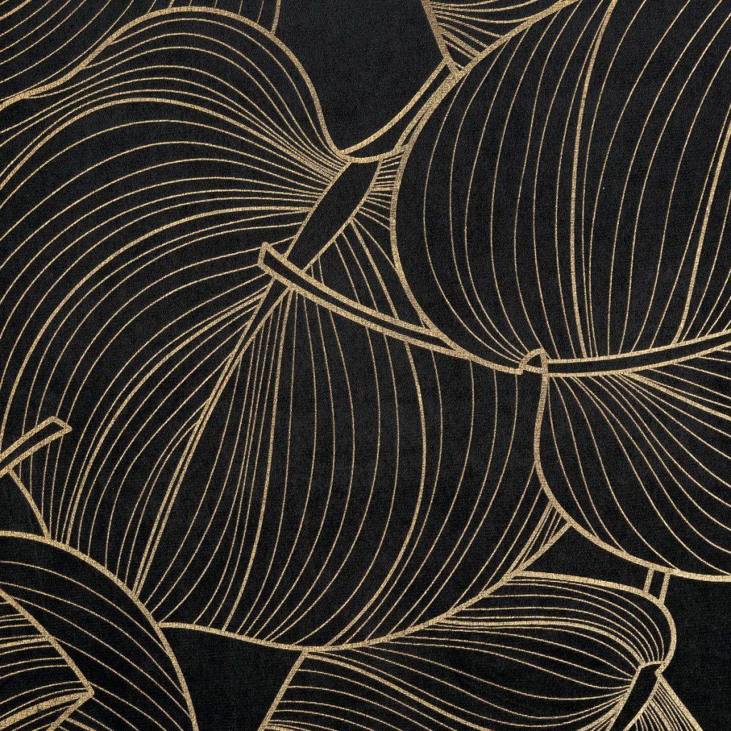 Majestátní černý sametový zatemňovací závěs VICTORIA s motivem zlatých listů leknínu, které v závěsu dominují a vyzdvihují sílu zlata . Šířka: 140 cm, délka 270 cm. Gramáž: 260 g/m2. Složení: 100% polyester. Praktické zavěšení na řasící pásce.