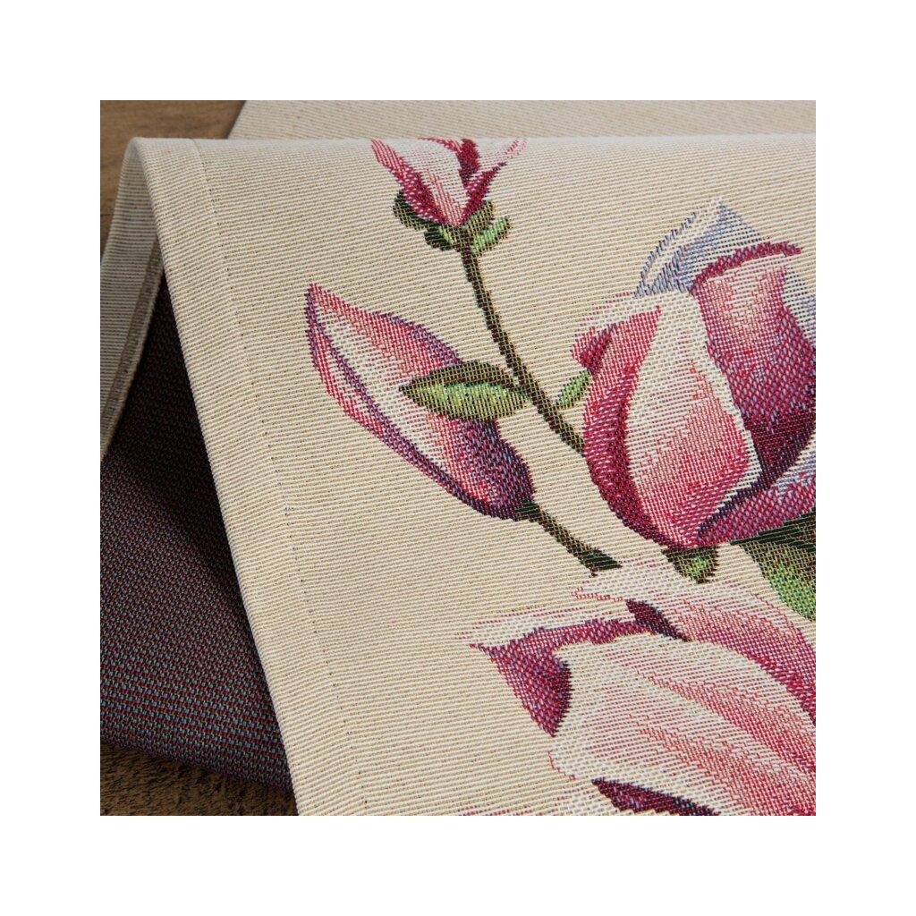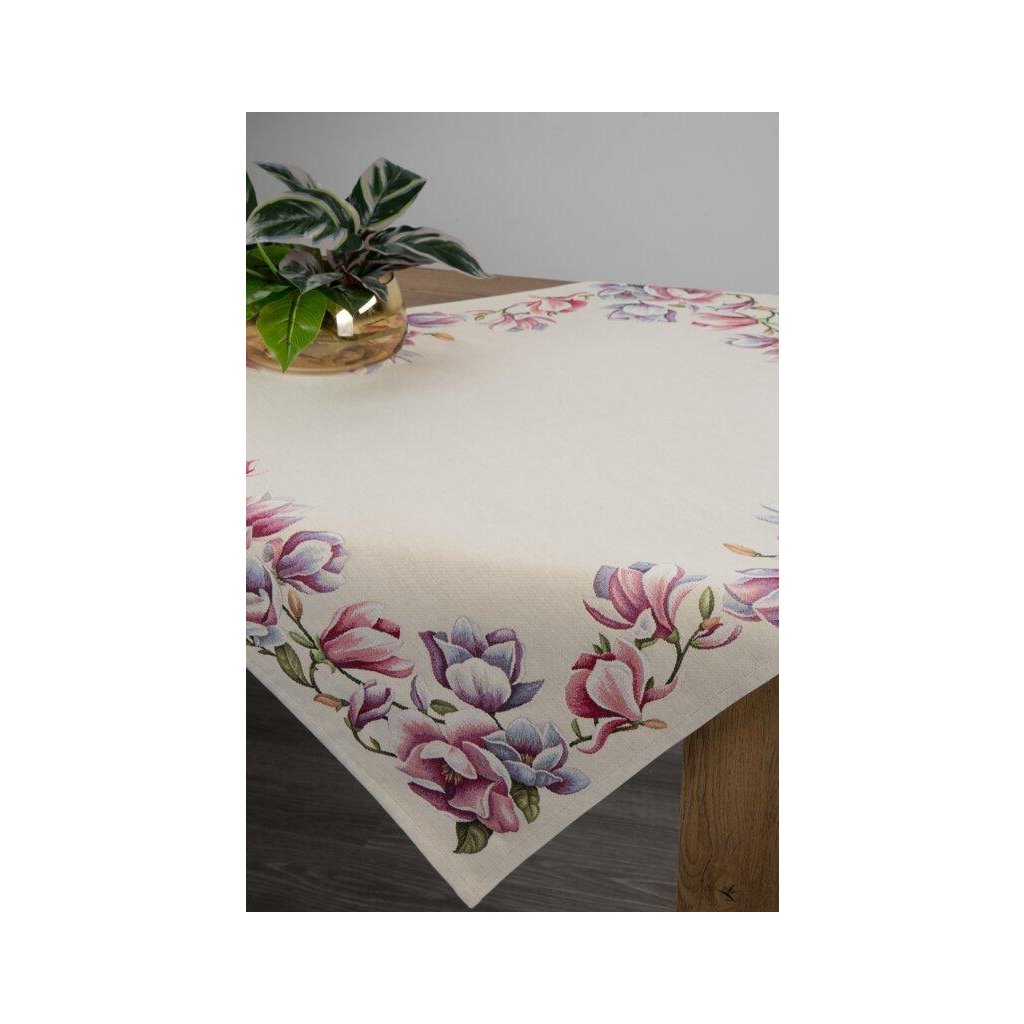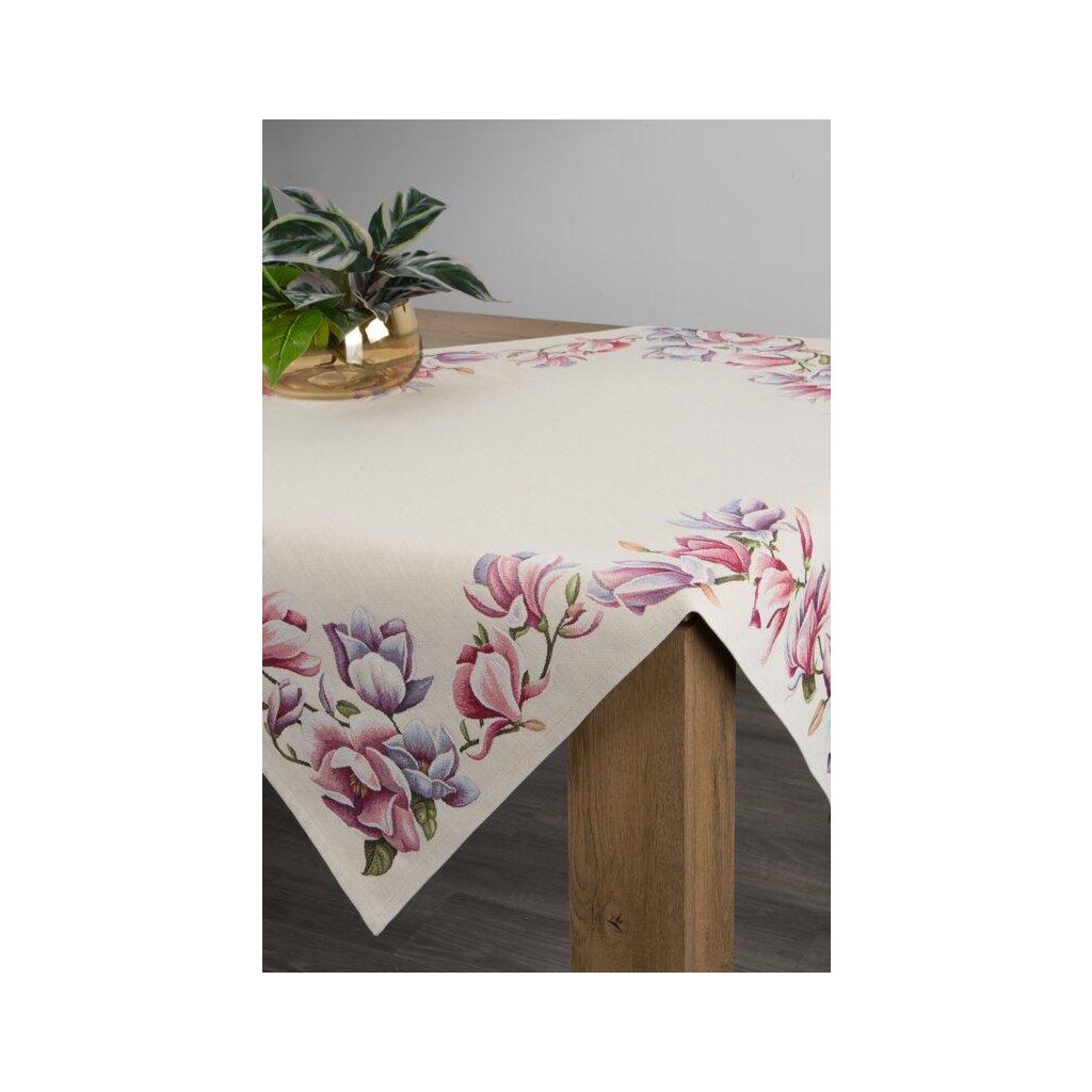 Gobelínový ubrus zdobený motivem rozkvetlé magnólie . Šířka: 100 cm, délka: 100 cm, barva: přírodní, Gramáž: 410 g/m2, Materiál: 75% polyester 22% bavlna 3% akryl