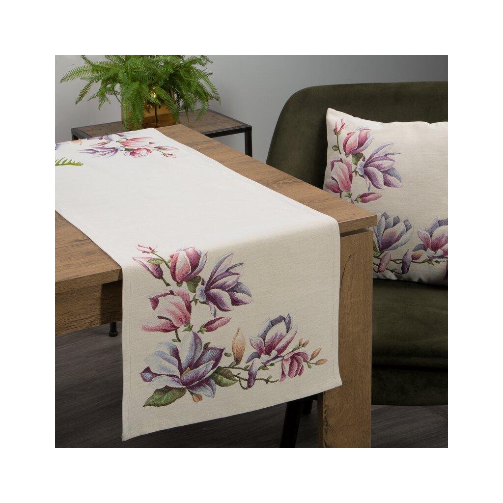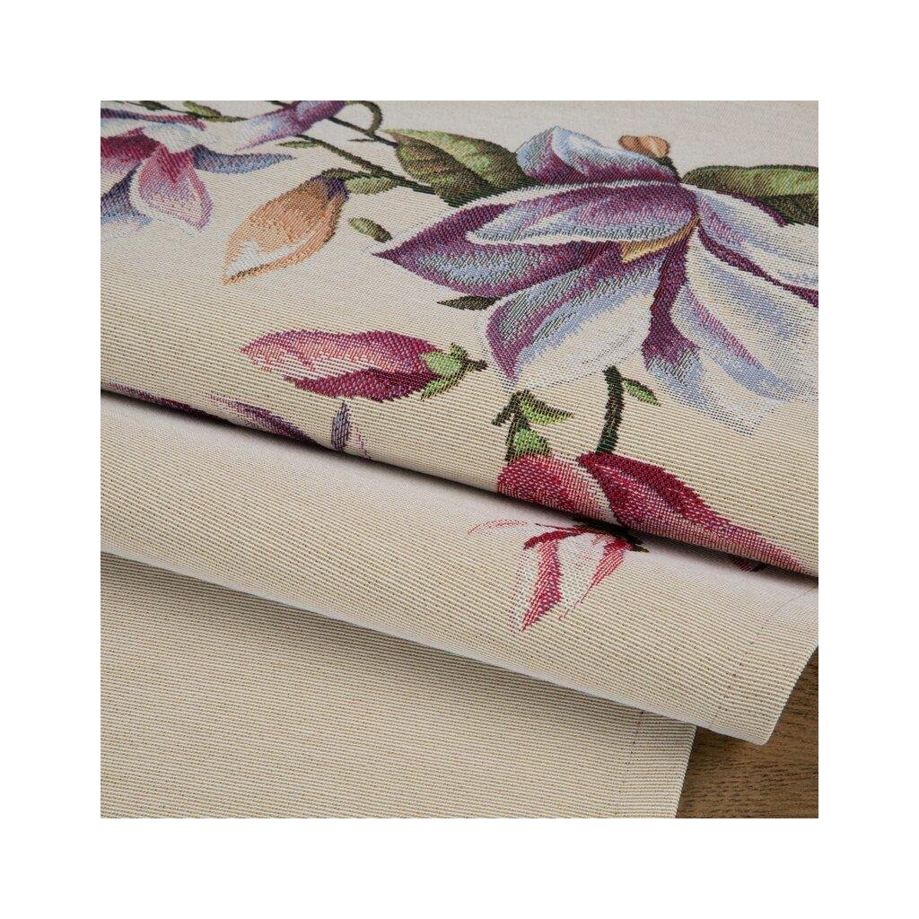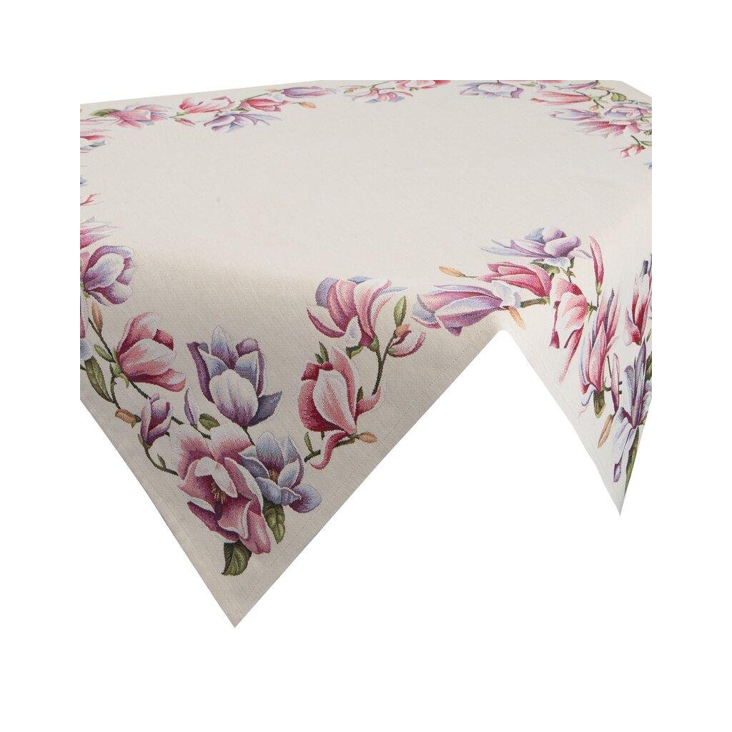 Gobelínový ubrus zdobený motivem rozkvetlé magnólie . Šířka: 100 cm, délka: 100 cm, barva: přírodní, Gramáž: 410 g/m2, Materiál: 75% polyester 22% bavlna 3% akryl