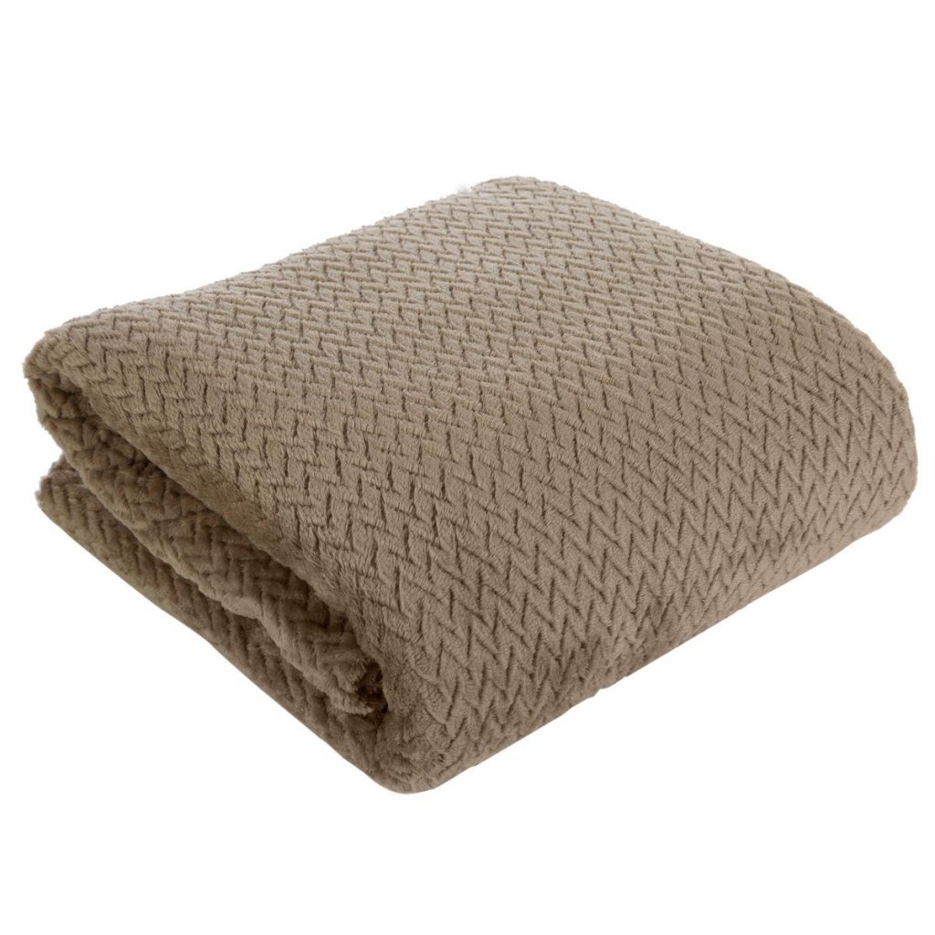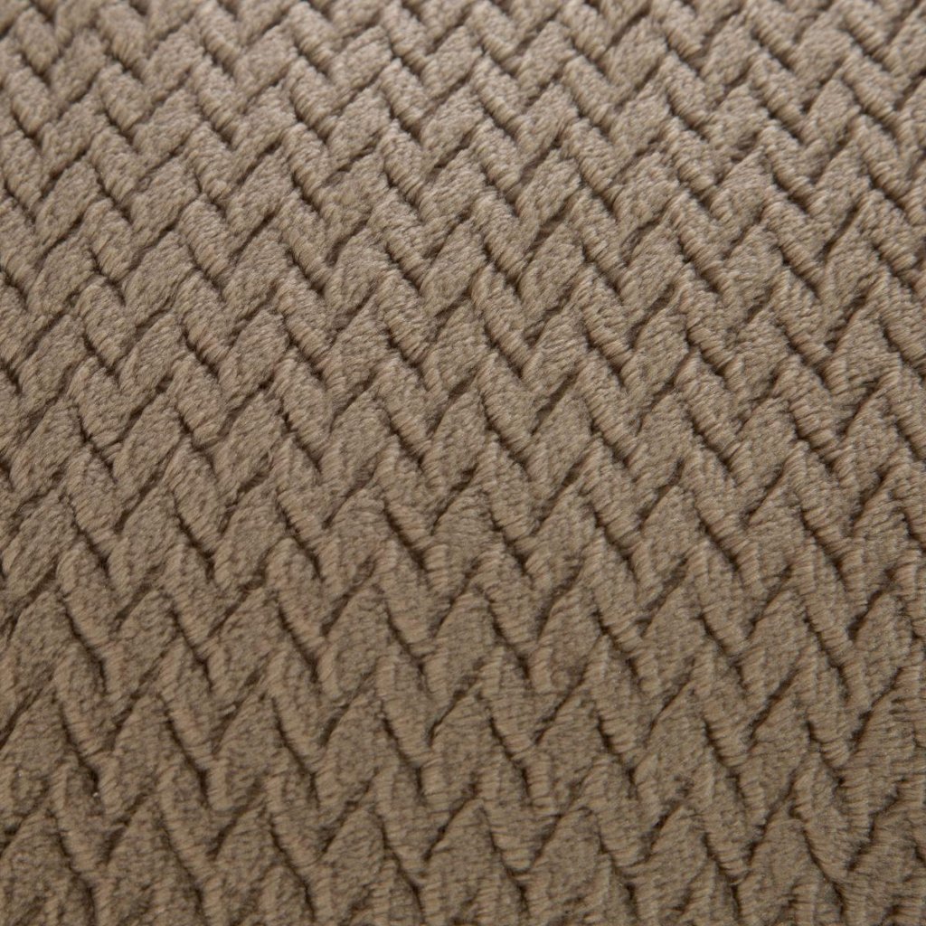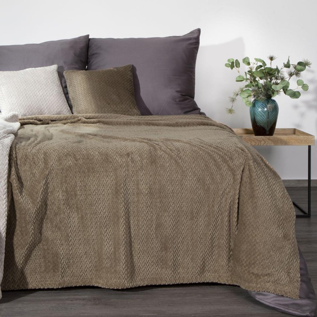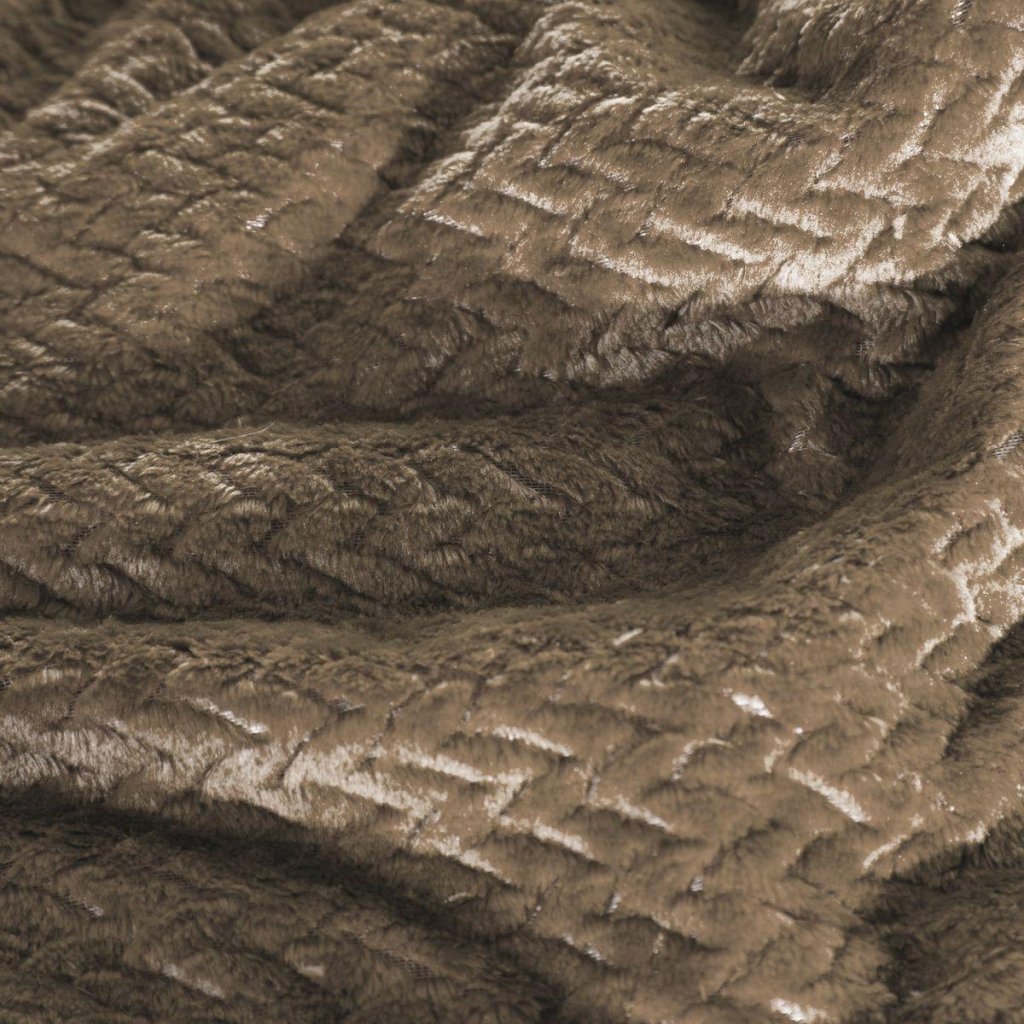Krásná deka vyrobená z látky příjemné na dotek. Jednobarevná tmavobéžová nadýchaná textura je zdobena minimalistickým vzorem rybích kostí.