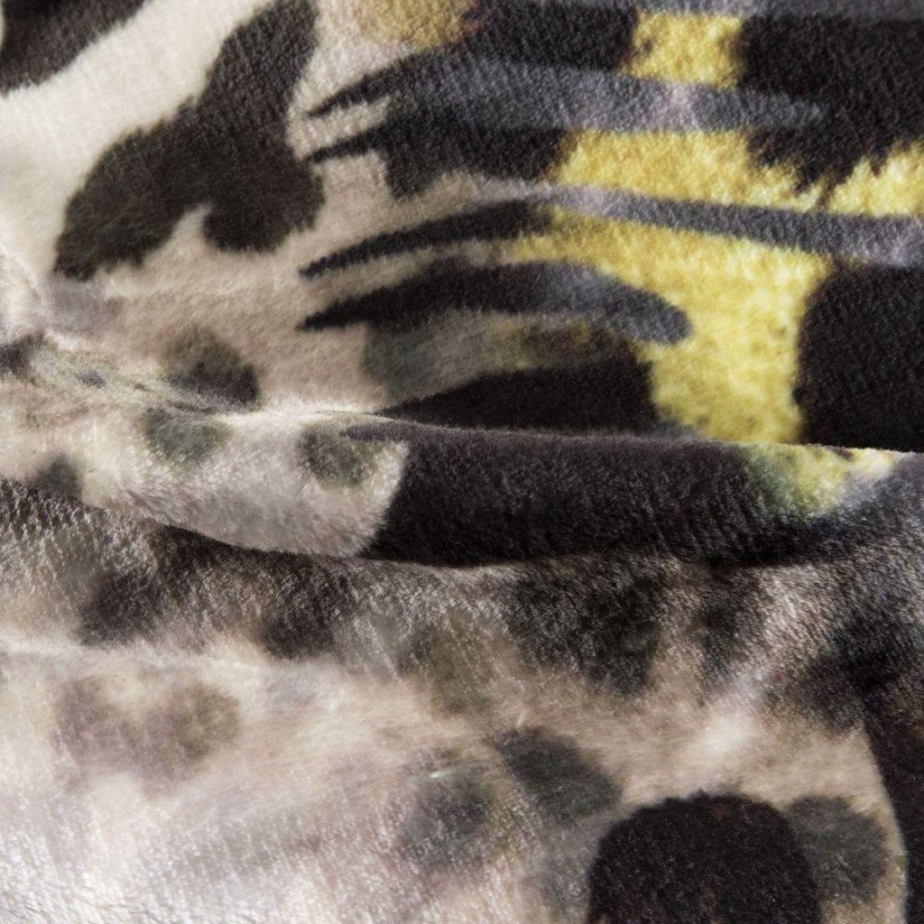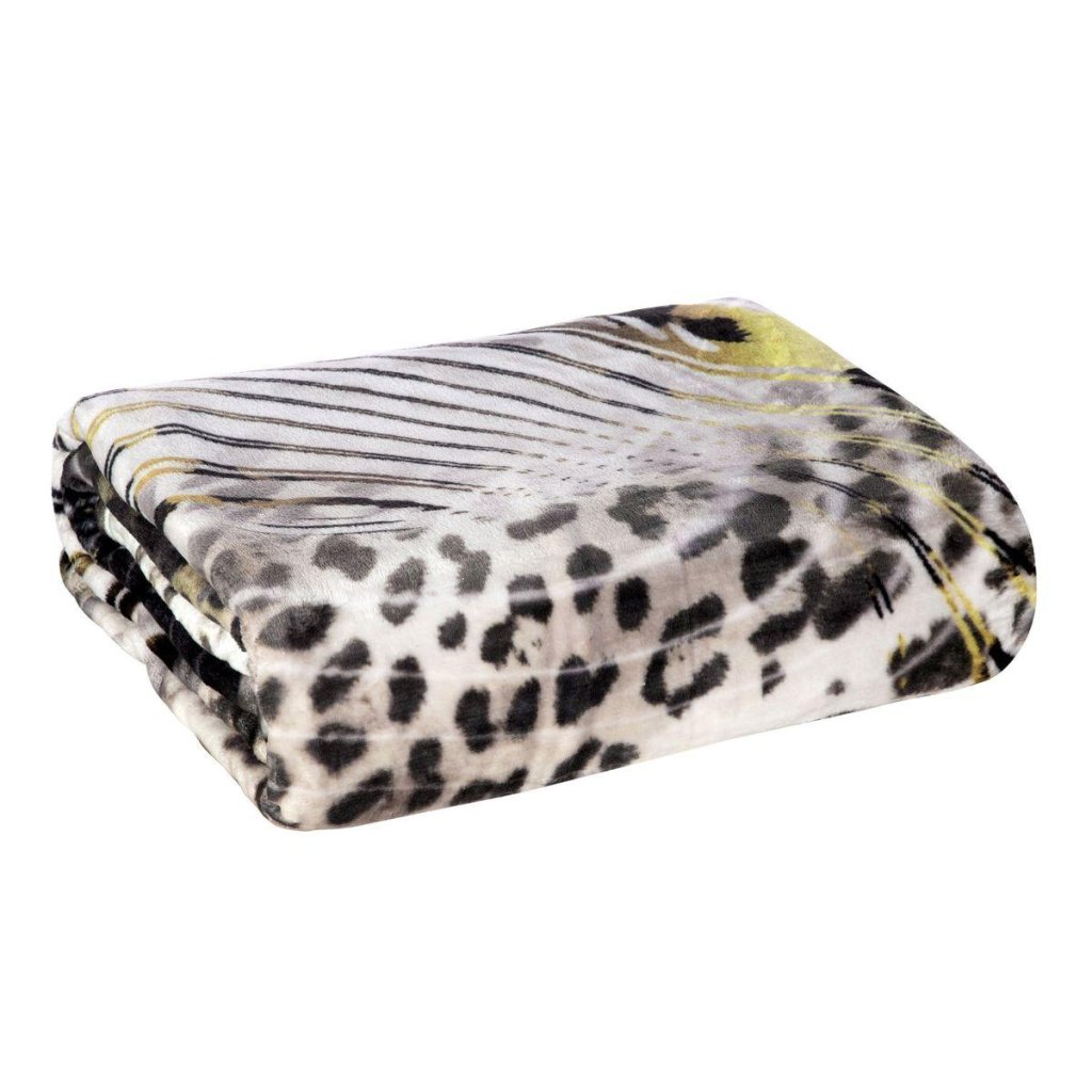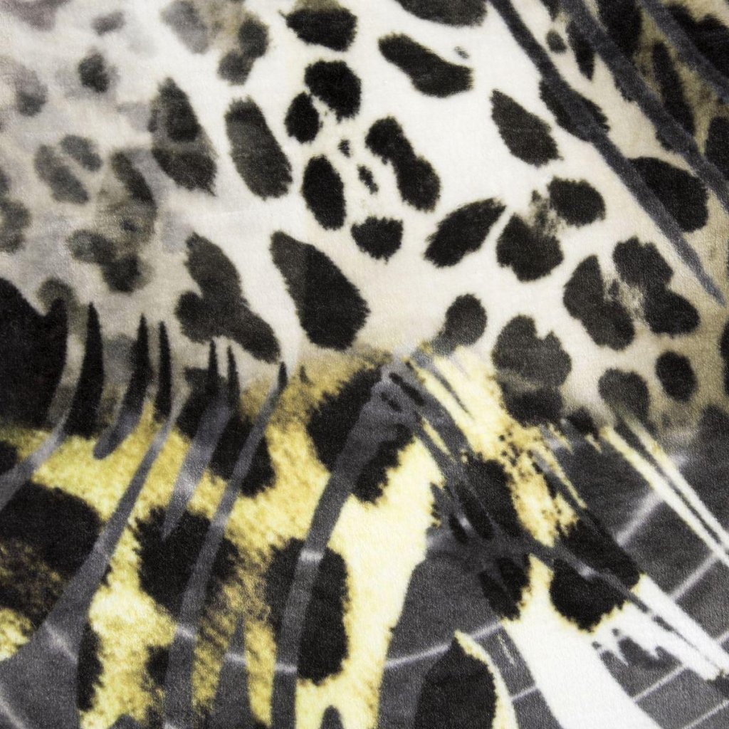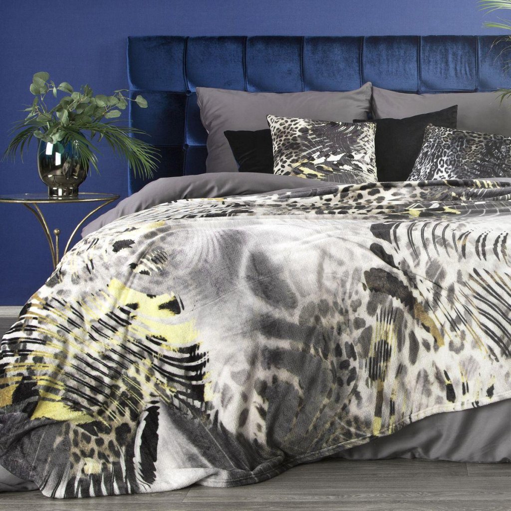 Super měkká flanel deka AGNES bílé barvy s exotickým vzorem v odstínech černé a zlaté barvy.