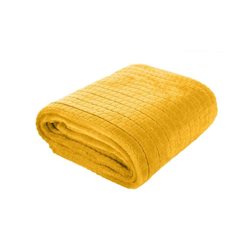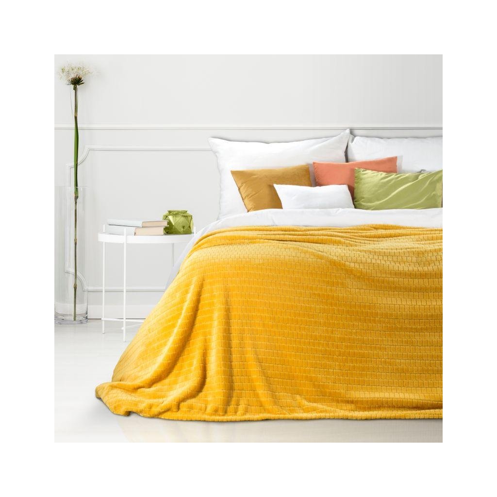 Působivá hořčicová deka, která krásně vyzdobí váš obývací pokoj nebo ložnici. Extrémně měkká látka, z níž byla přikrývka vyrobena vás každý večer zabalí radostí a poslouží Vám jako příjemná přikrývka, ale i jako fenomenální dekorace interiéru. Látka s původní texturou, která je ozdobena vzorem, který působí dojmem 3D efektu se bude krásně vyjímat ve Vaší ložnici nebo v obývacím pokoji na pohovce. Jemný čtvercový vzor deky zdůrazní moderní charakter interiéru a dodá mu útulnou atmosféru. Měkká, pečlivě vyrobena přikrývka je praktickým a krásným doplňkem, který byste měli mít v každé domácnosti.