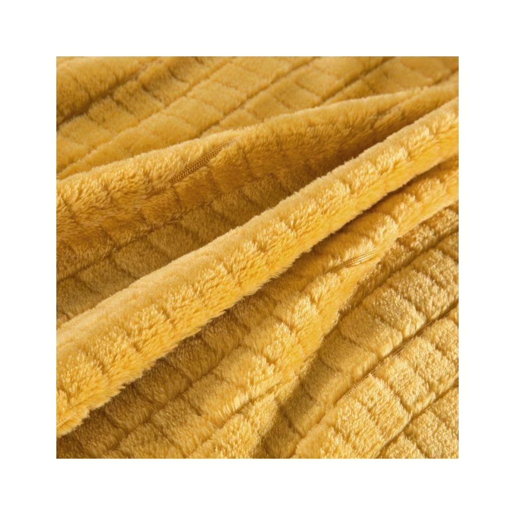 Klasická hořčicová přikrývka vyrobená z jemného vlákna. Jednobarevná načechraná textura je zdobena minimalistickým čtvercovým 3D efektem.