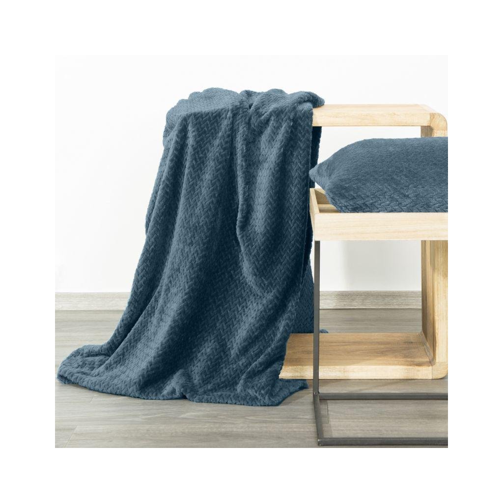 Krásná deka vyrobená z látky příjemné na dotek. Jednobarevná modrá nadýchaná textura je zdobena minimalistickým vzorem rybích kostí.