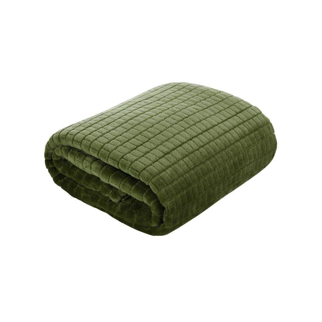 Klasická olivovězelená přikrývka vyrobená z jemného vlákna. Jednobarevná načechraná textura je zdobena minimalistickým čtvercovým 3D efektem.