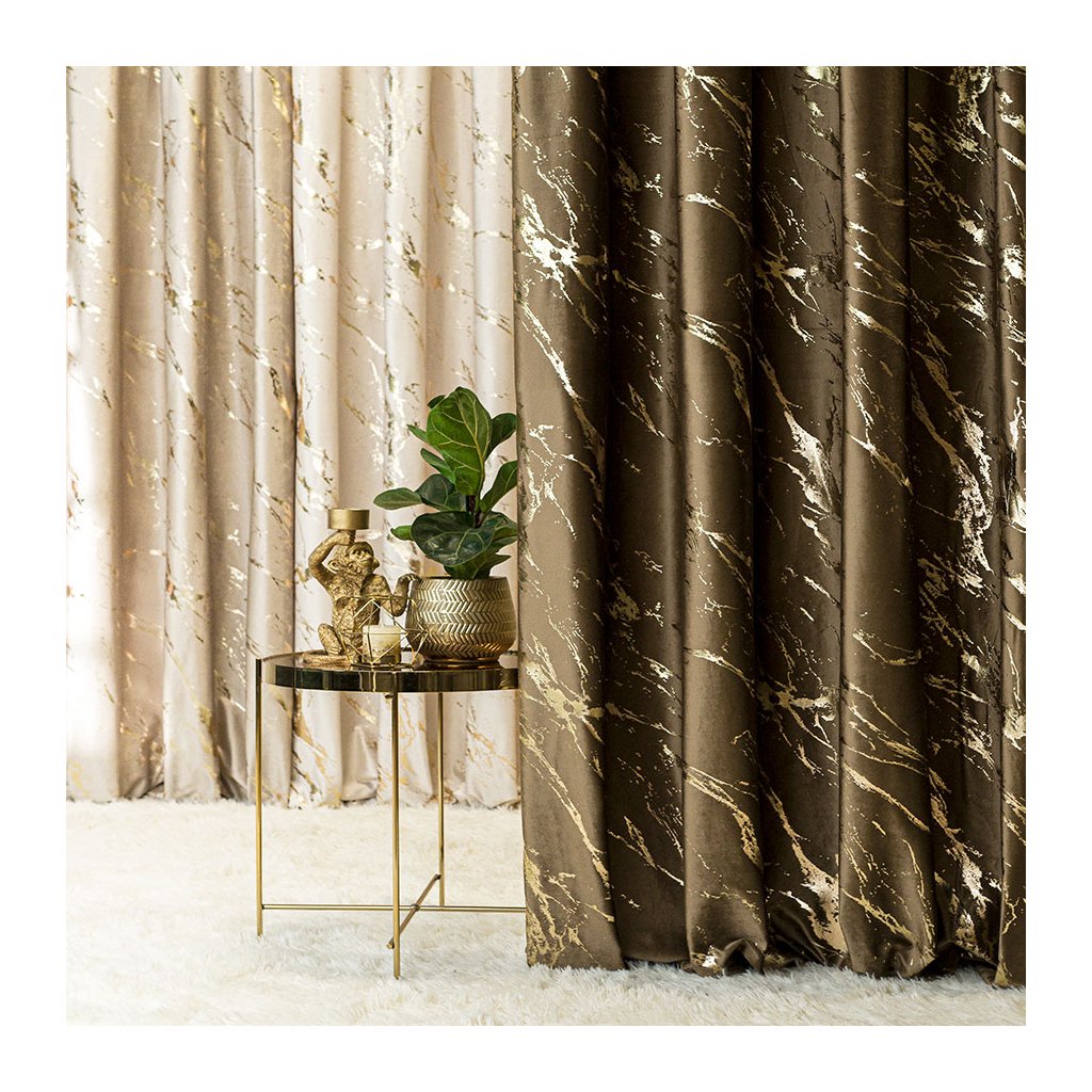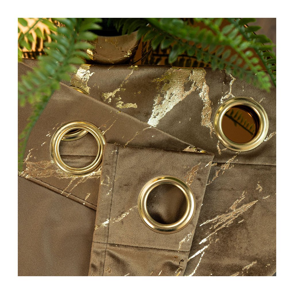 Hnědý sametový závěs se zlatým potiskem na kroužcích MARMA 140x250 cm