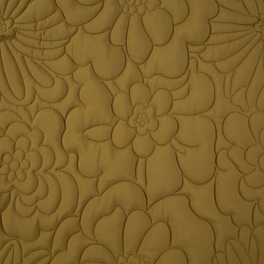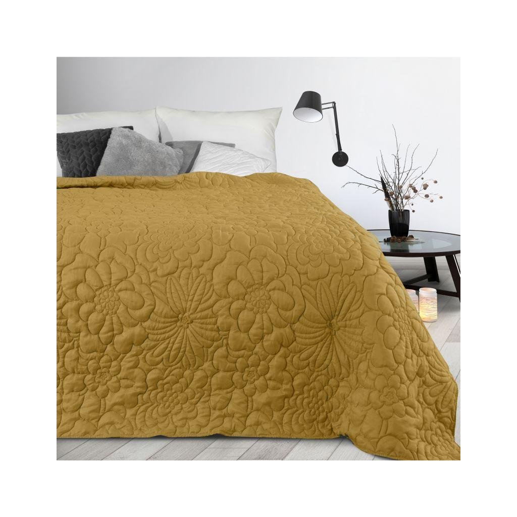 Přehoz na postel ALARA4 hořčicové barvy se vzorem květin, který je vyražen metodou hotpress. Lze prát v pračce. 170x210 cm