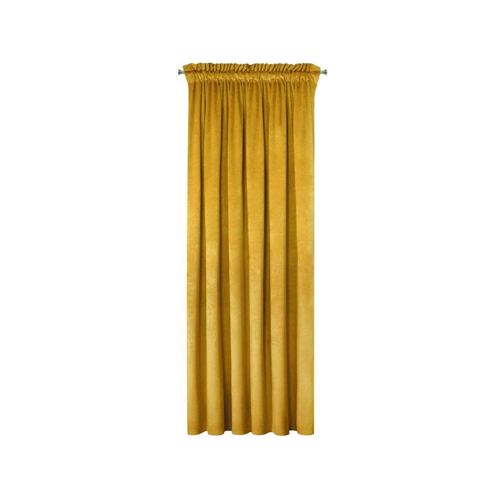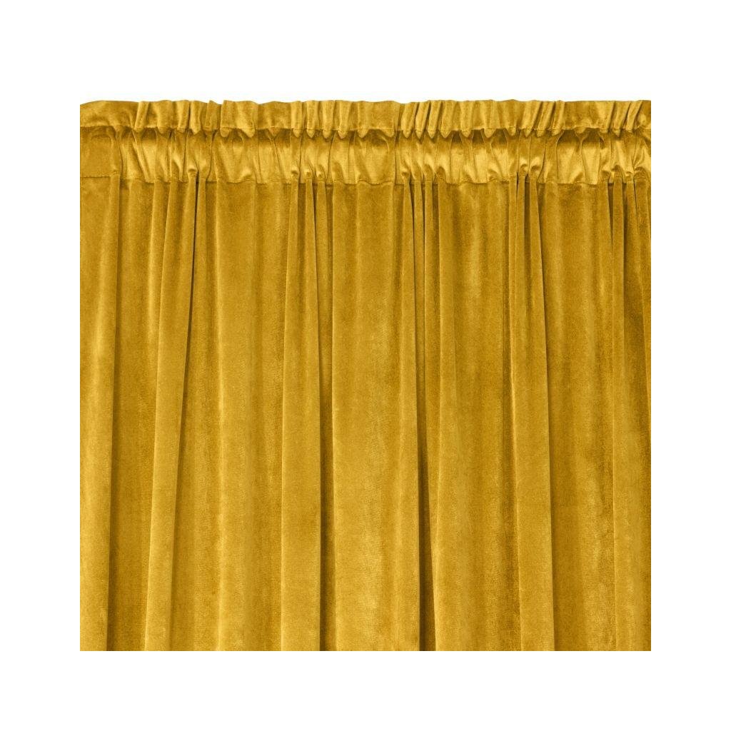 Sametový jednobarevný hořčičný závěs. Sametová látka o hustotě 200g/m2 poskytuje střední stupeň vnitřního zatemnění. Šířka: 135 cm, délka: 300 cm. Složení: 100% polyester. Praktické zavěšení na řasící pásce.