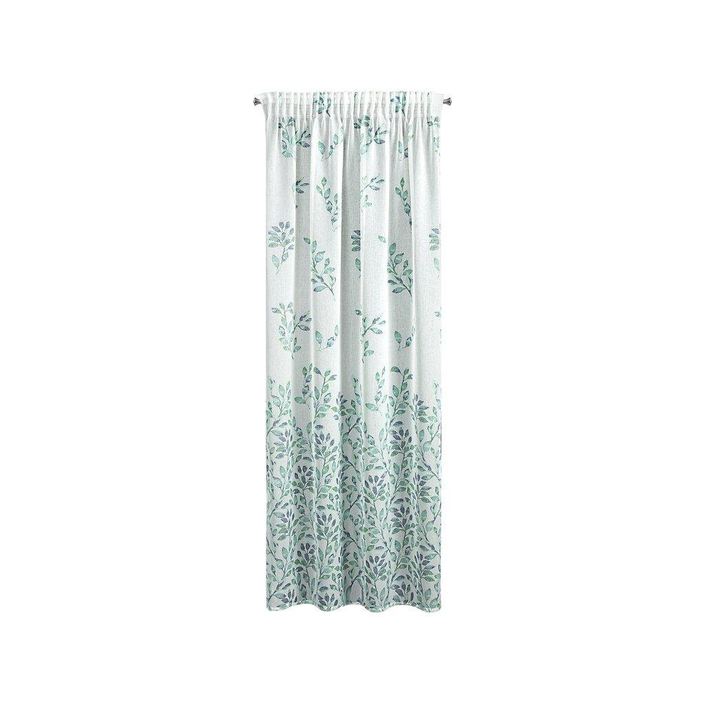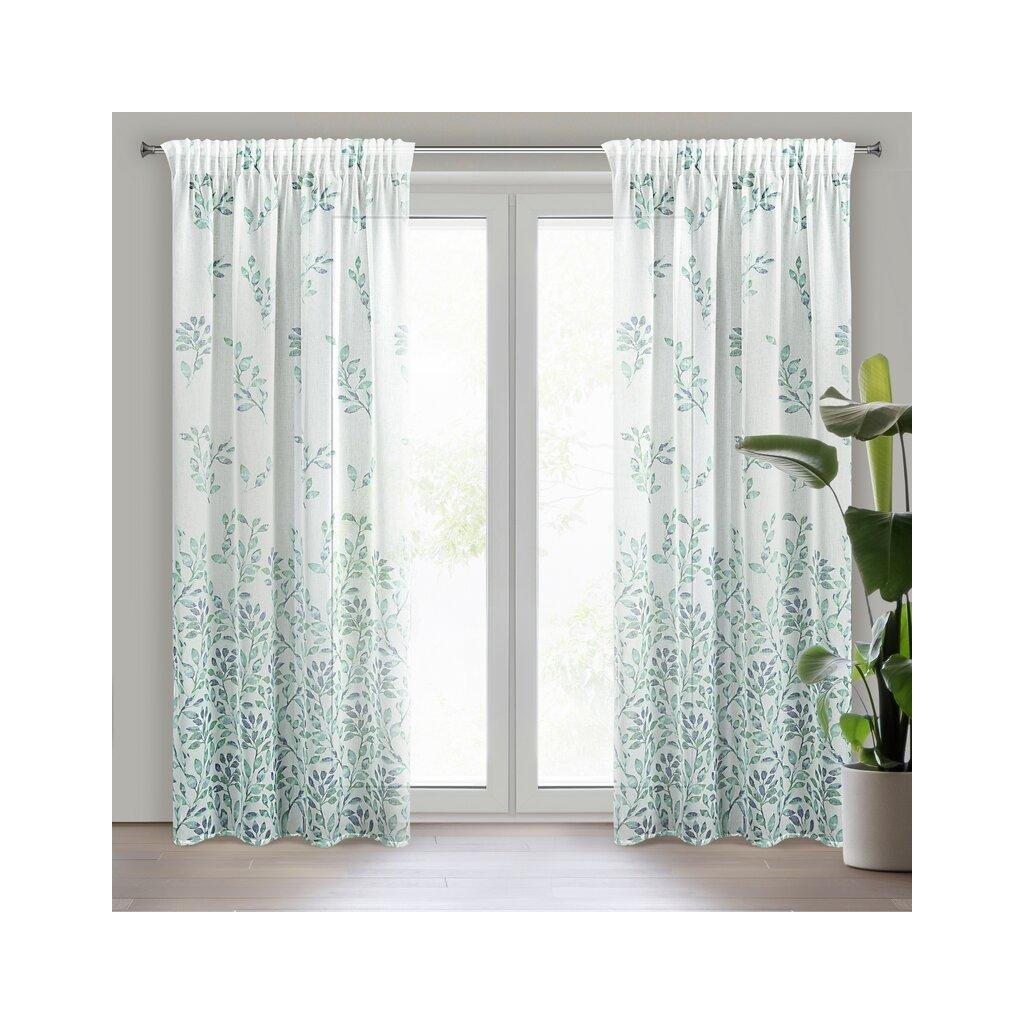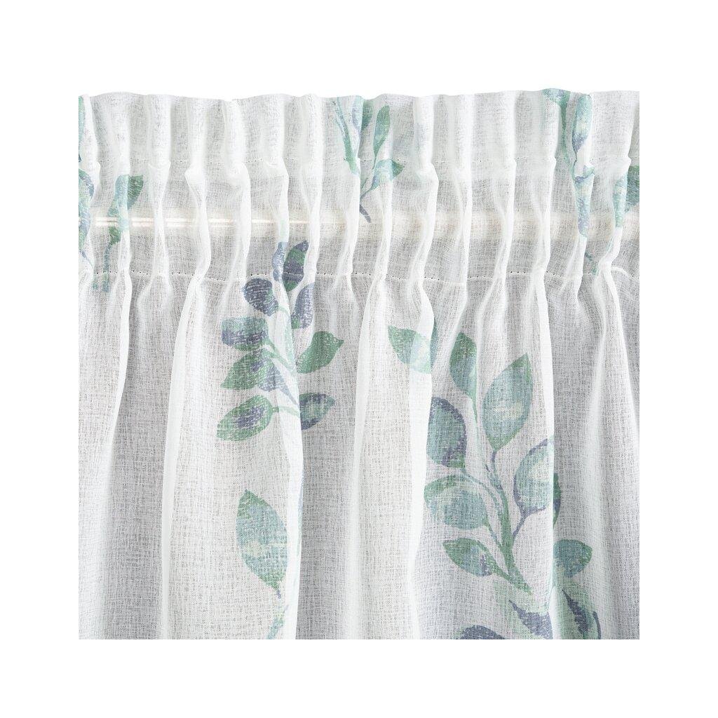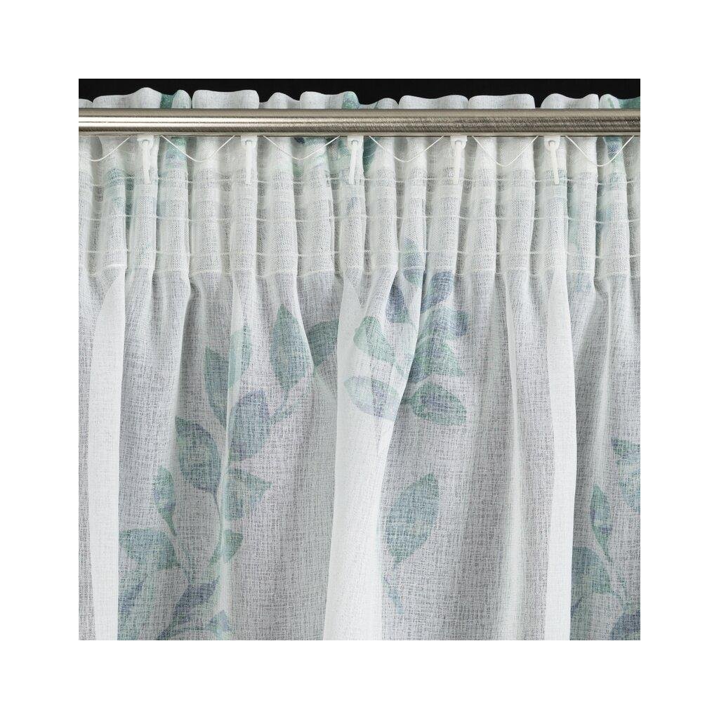 Závěs CLARISSA, nádherná okenní dekorace, vyrobená ze světlé látky podobné gáze ve spodní části závěsu s motivem lístků . Šířka: 140 cm, délka: 270 cm, barva: bílé pozadí s modrými a tyrkysovými lístky, Hmotnost: 75 g/m2, Složení: 100% polyester. Lehké žehlení a praní. Praktické zavěšení na řasící pásce .