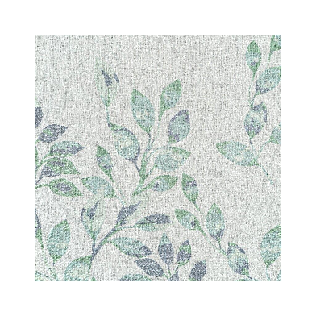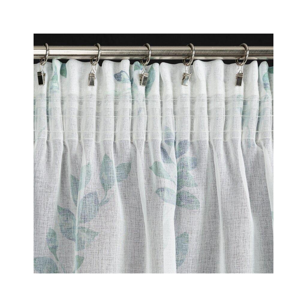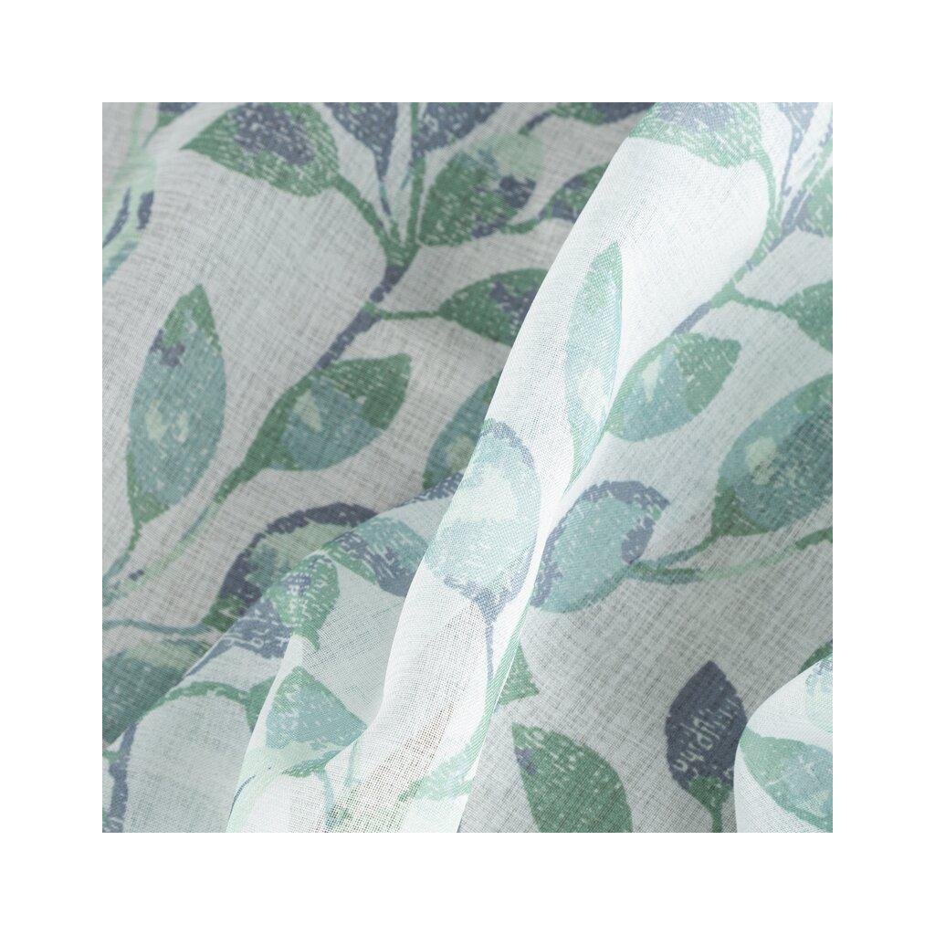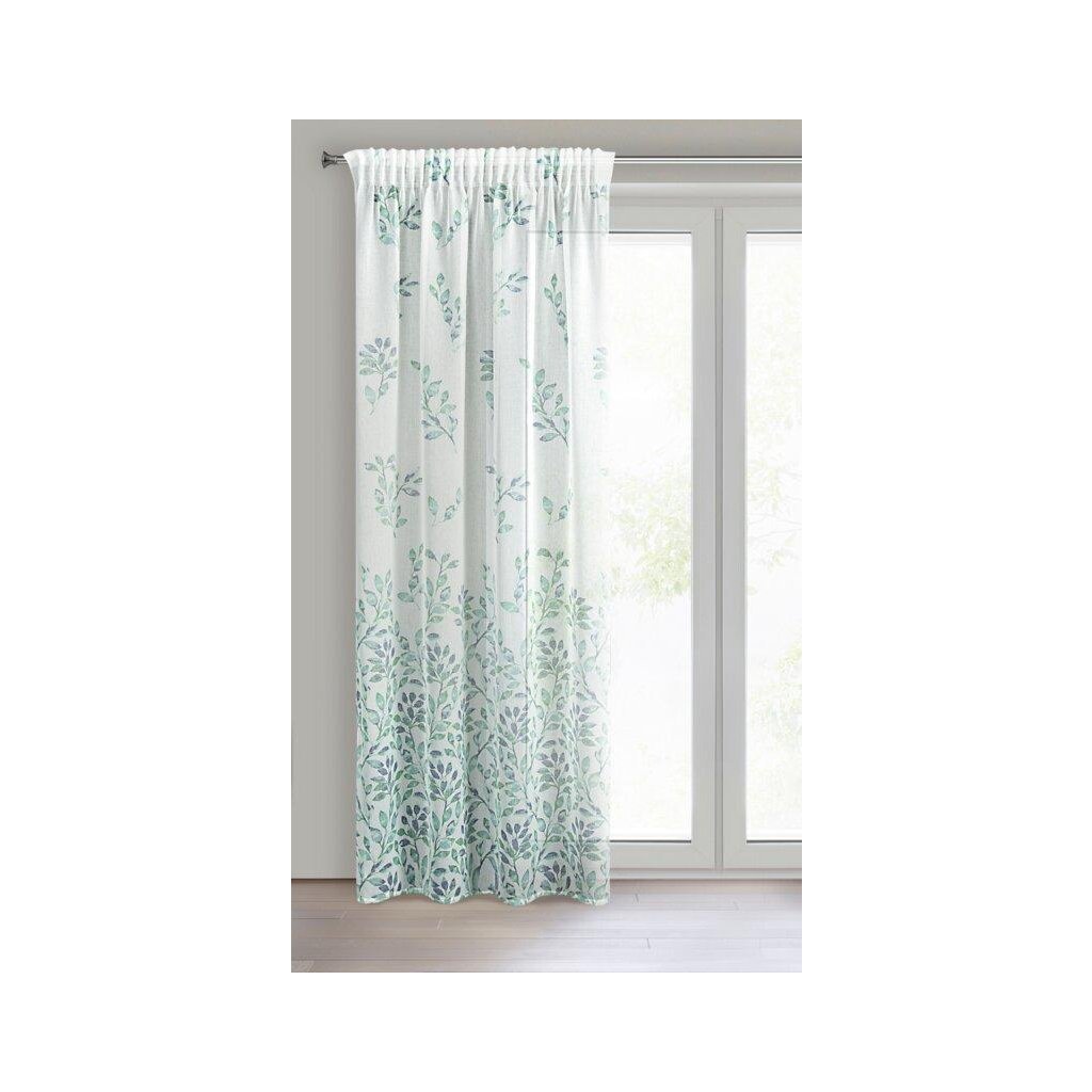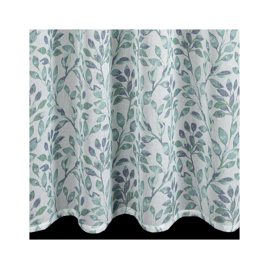 Závěs CLARISSA, nádherná okenní dekorace, vyrobená ze světlé látky podobné gáze ve spodní části závěsu s motivem lístků . Šířka: 140 cm, délka: 270 cm, barva: bílé pozadí s modrými a tyrkysovými lístky, Hmotnost: 75 g/m2, Složení: 100% polyester. Lehké žehlení a praní. Praktické zavěšení na řasící pásce .