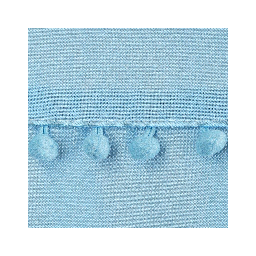 Jemný poloprůhledný jednobarevný závěs světle modré barvy ozdobený jemným lemováním s kuličkami ve stylu boho. Měkká tkanina se dá velmi snadno žehlit. Šířka 135, délka 260 cm.
