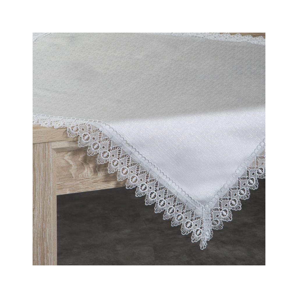 Exkluzivní krémový ubrus vyrobený z elegantní látky s vazbou charakteristickou pro len, zdobený lemem z guipure krajky. Šířka: 80 cm, délka: 80 cm. Složení: 100% polyester