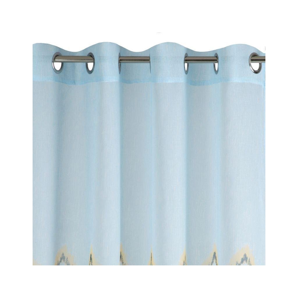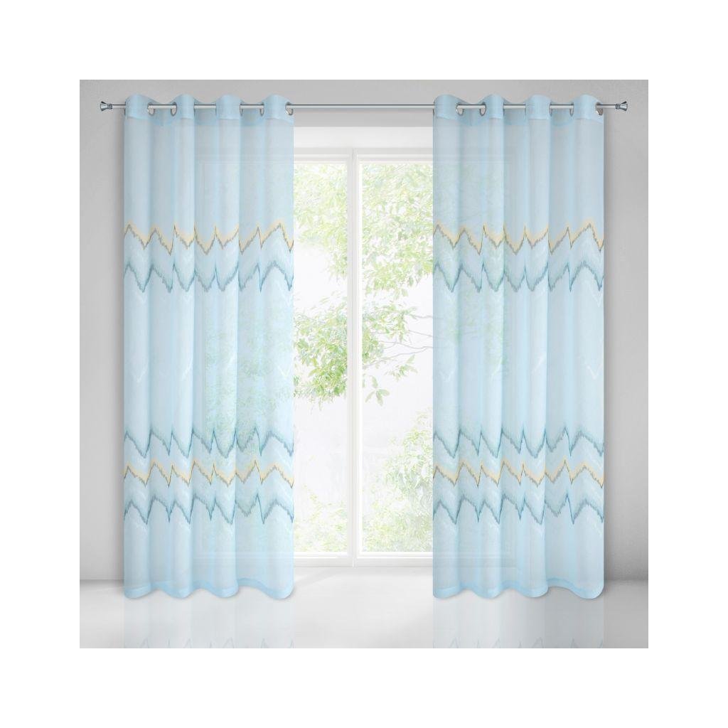 Lehká záclona modré barvy s jemým odstínem, zdobená módním klikatý vzorem. Perfektně se hodí do skandinávského interiéru. Šířka: 140 cm, délka: 250 cm. Složení: 100% polyester. Snadné žehlení a praní. Praktické zavěšení na kovových kroužcích.