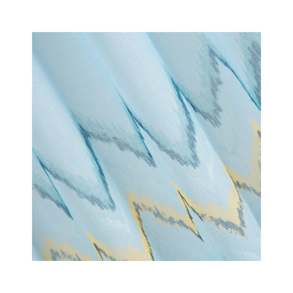Záclona s moderním charakterem, zdobená vzorem stínovaných cikcak. Kroužky umístěny v horní části vytvářejí z jemné látky pravidelné vlny. Tento způsob upevnění znamená, že změna záclony trvá jen krátce. Potisk se symetricky uspořádaným vzorem vnáší do interiéru prvek dynamiky a příjemná a jemná struktura materiálu příjemného na dotek v studených odstínech interiér nádherně zdobí. Perfektní na dekoraci interiéru v boho stylu.