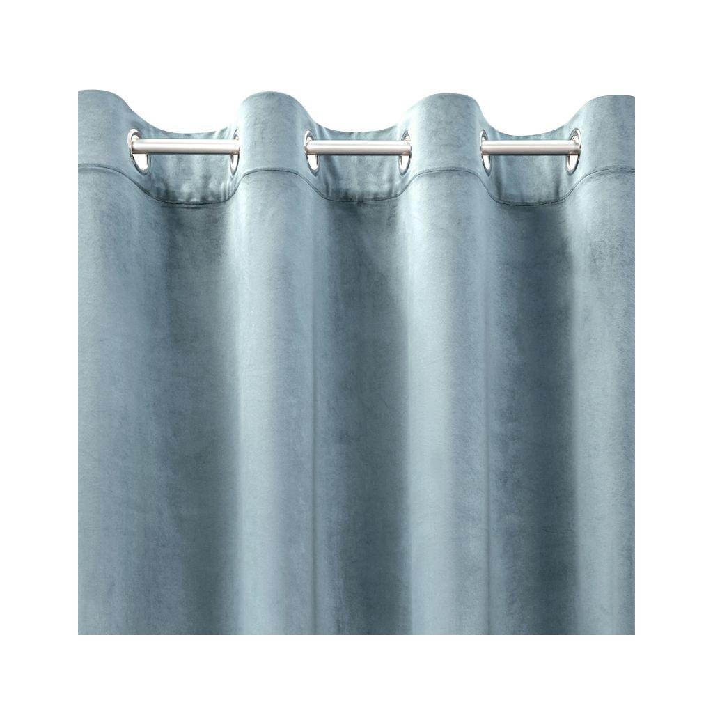 Sametový jednobarevný světle modrý závěs. Sametová látka o hustotě 200g/m2 poskytuje střední stupeň vnitřního zatemnění. Šířka: 140 cm, délka: 250 cm. Složení: 100% polyester. Praktické zavěšení na kovových kroužcích.