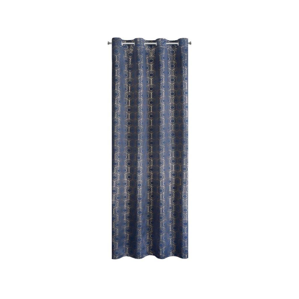 Zatemňovací modrý závěs se zlatým geometrickým vzorem. Závěs Vám poslouží i jako vynikající tepelná a zvuková izolace interiéru. Šířka: 135 cm, délka: 250 cm. Složení: 100% polyester. Snadné žehlení. Praktické zavěšení na kroužcích.