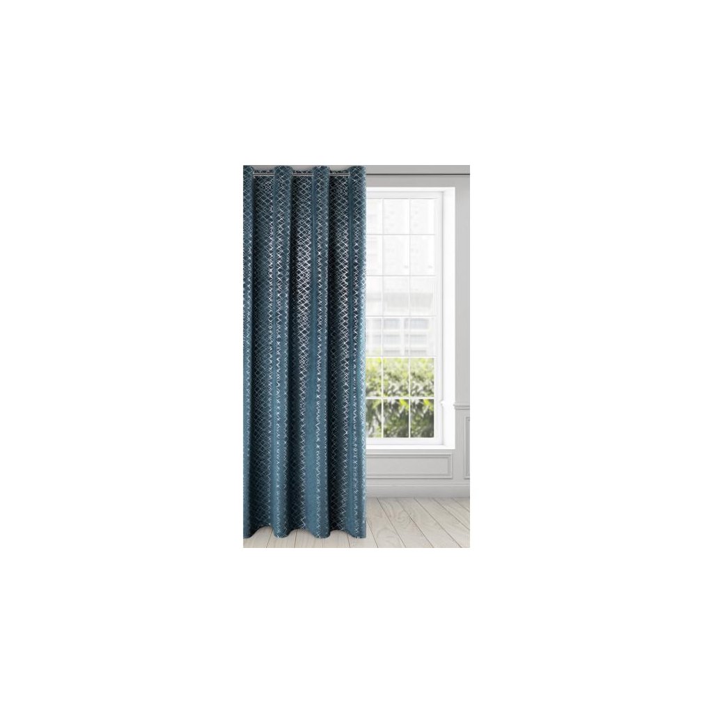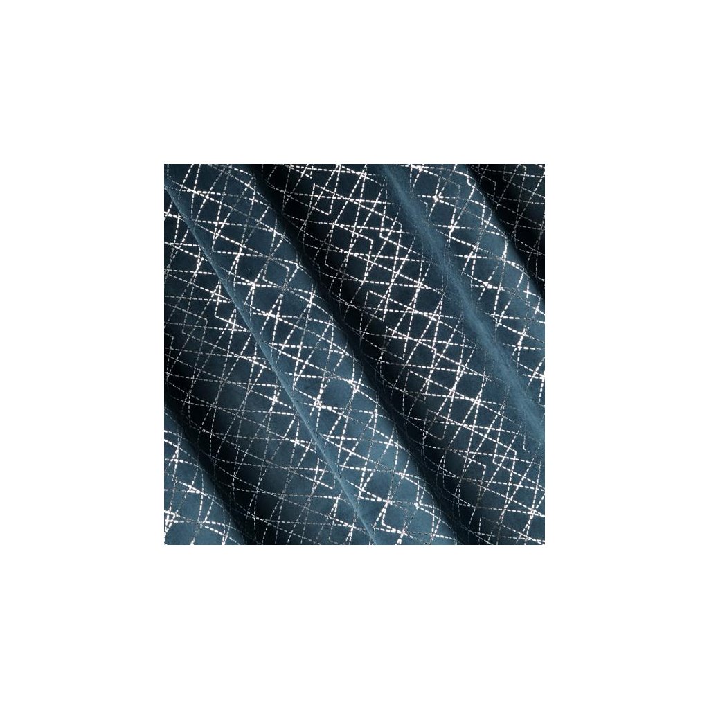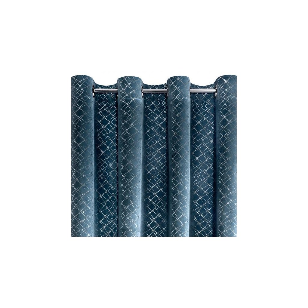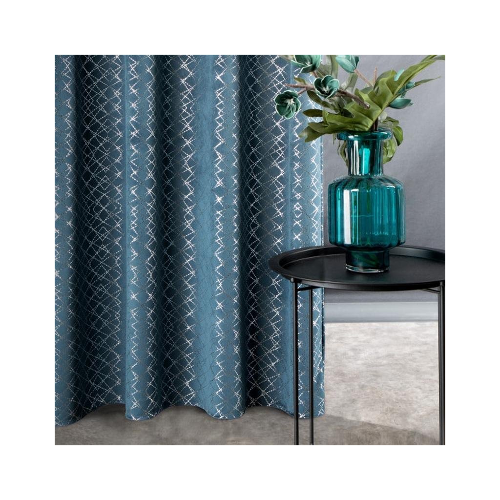 Sametový závěs modré barvy se stříbrným geometrickým vzorem. Masivnější látka poskytuje vyšší stupeň vnitřního zatemnění. Šířka: 140 cm, délka: 250 cm. Složení: 100% polyester. Praktické zavěšení na kovové kroužky.