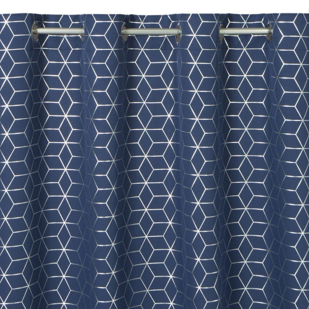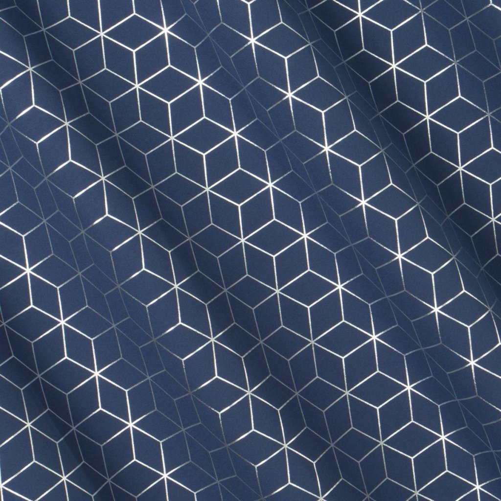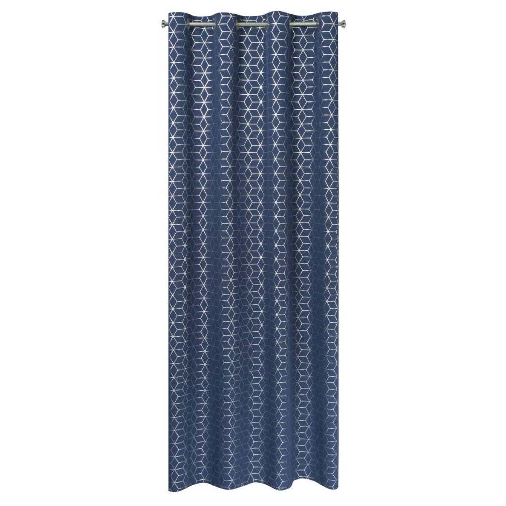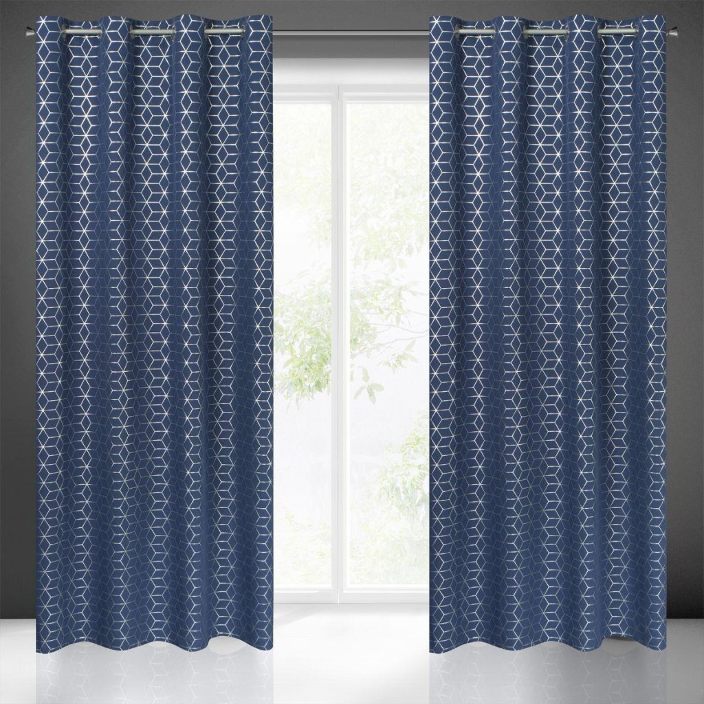 Elegantní, minimalistický modrý závěs CUBE se stříbrným geometrickou potiskem. Ideální do ložnice nebo obývacího pokoje. Šířka: 140 cm, délka: 250 cm. Složení: 100% polyester. Gramáž: 140 g / m2. Žehlení z rubové strany. Praktické zavěšení na kovové kroužky.